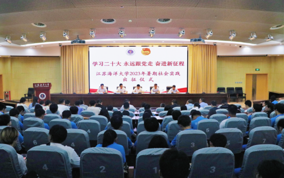 6月29日下午,我校2023年大学生暑期社会实践出征仪式在黄海厅举办。副校长朱国军出席并讲话,党委学工部、党委研工部、团委负责人,各学院党委副书记、团委负责人,2023年暑期社会实践团队指导教师、社会实践团队成员等三百余人参加本次仪式,仪式由校团委副书记王衍主持。