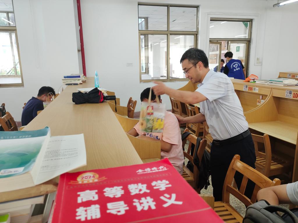 上午九点,陈德翼等人到图书馆自习室与考研学子亲切交流,了解同学们暑期备考情况,叮嘱大家要抓好暑期黄金时间,保持高效学习之余也要适度放松,以最佳的身心状态积极迎考,并为同学们送去清凉慰问品。同学们纷纷感谢学校的关心和鼓励,表示学校的慰问让自己更有信心和底气去应对考研路上的困难挑战,今后将脚踏实地,全力以赴,为学校争光,为自己添彩。