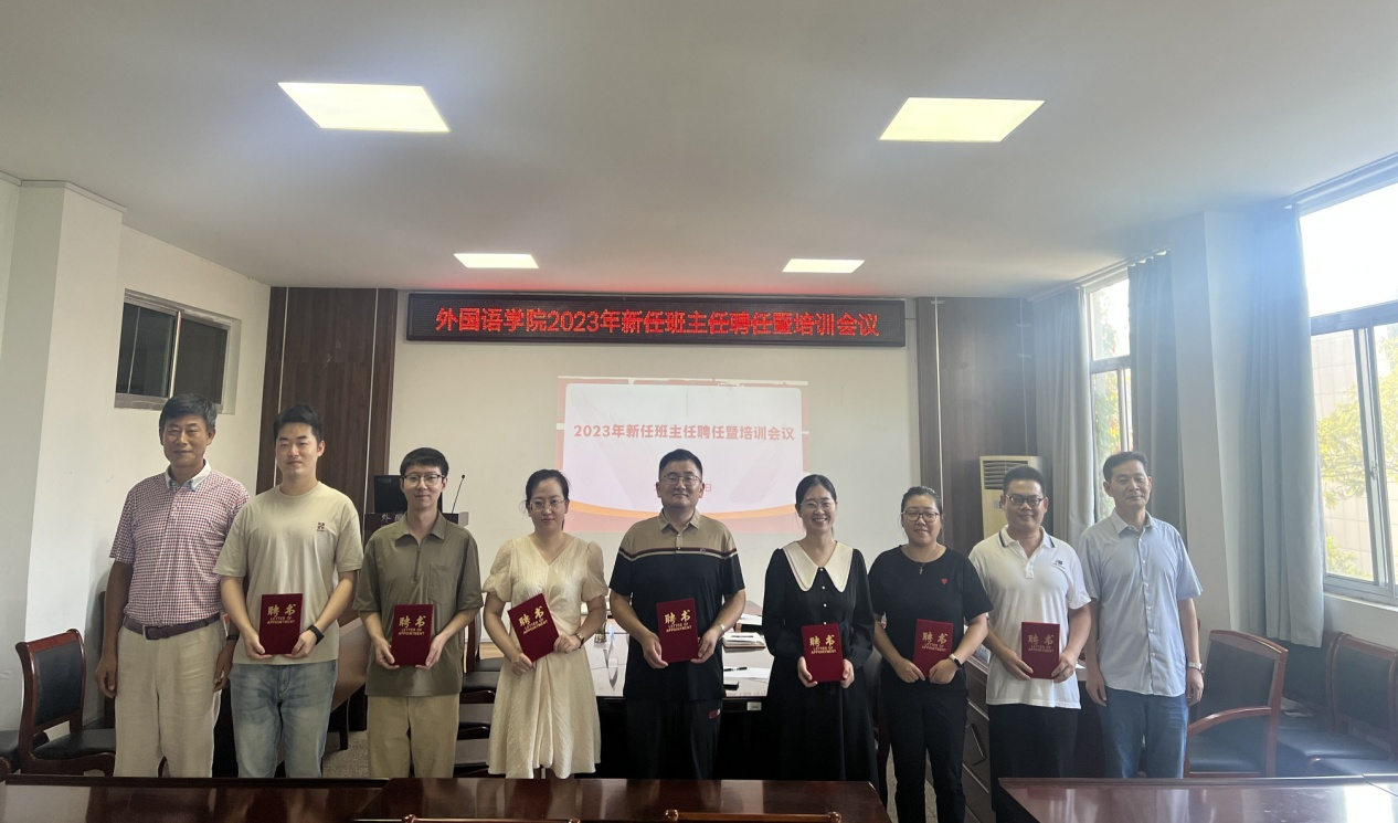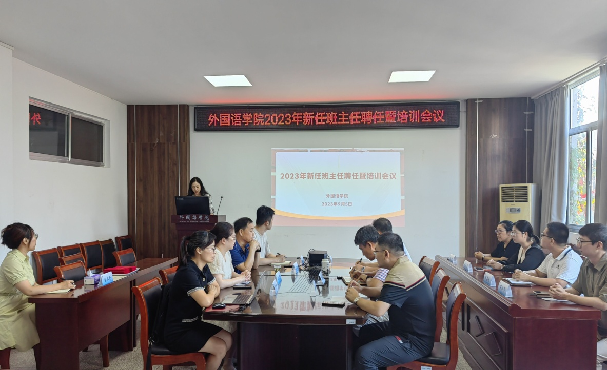 王熙首先宣读外国语学院聘任2023年新任班主任名单,田德勇、陆文前分别给新任班主任颁发聘书并合影留念。王正杰从三方面进行班主任工作培训,他强调作为班主任要有热情,用心与学生做朋友;要注重同学们的学业,形成良好的学风;要加强班集体建设,增强班级凝聚力。李平围绕“做一名有温度的班主任”从七个方面进行了经验分享,强调班主任要有四“心”,即爱心、耐心、责任心、公平心,并分享自己与学生之间的故事来说明言传身教,因材施教的重要性。王熙从识别心理问题的七种方法、七条线索展开培训,强调要有效地进行家校沟通,协同家长、辅导员共同做好学生的心理健康工作。