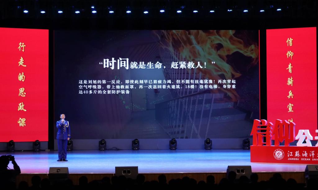 《以青春之生命 延家国之华年》《小沙东海战》《青口红嫂》《奋斗 正青春》等情景故事的讲述,再现了连云港抗战史中的惊险故事。同学们在感受宁死不屈的革命精神,舍小家为大家的革命情怀中,进一步增强了对历史的敬畏之心,也更加坚定了他们的爱国信念。江苏海洋大学艺术团带来的大合唱《走出教室的思政课》,用激情四溢的歌声,展示了这场思政盛宴所蕴含的精神力量。
