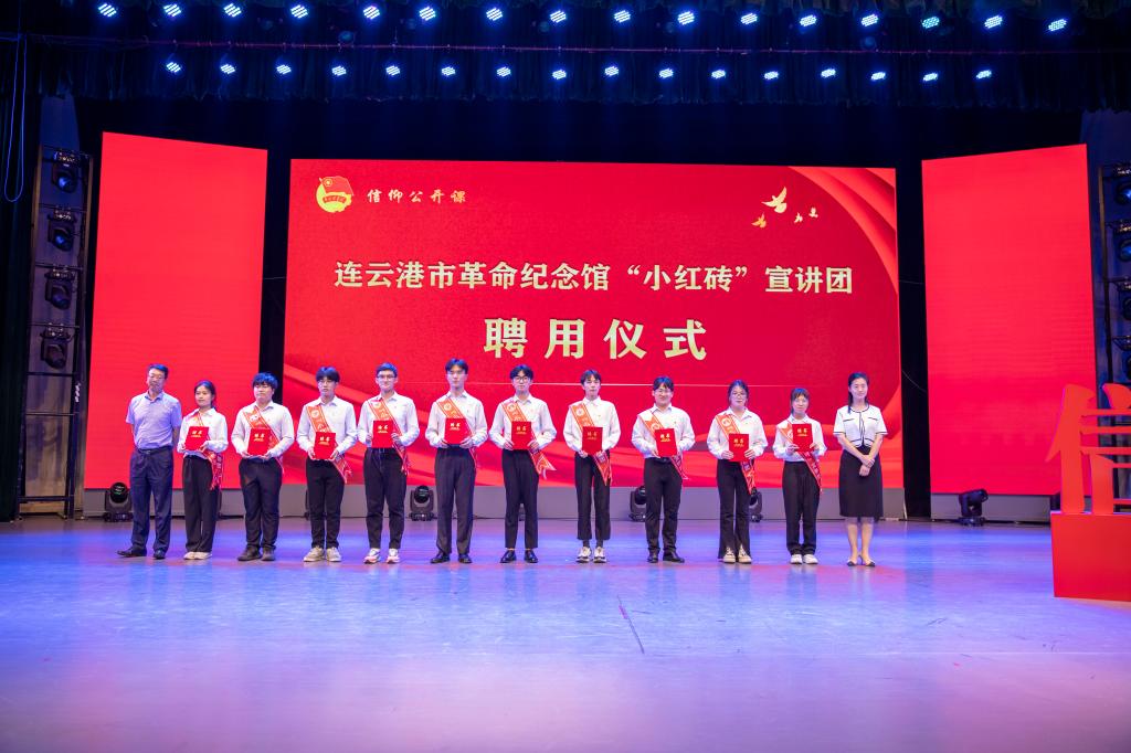 市革命纪念馆馆长刘光亚和共青团连云港市委员会副书记王帆为江苏海洋大学入选“小红砖”宣讲团的10位成员颁发聘书。