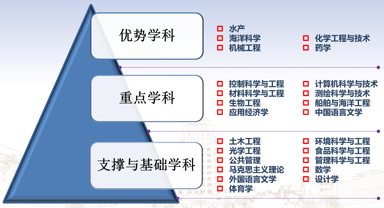 充分发挥学科建设的龙头作用,按照“高起点、高要求、高水平”的标准整体规划全校学科建设,出台《中共江苏海洋大学委员会关于进一步加强学科建设的若干意见》《江苏海洋大学学科建设五年行动计划(2021-2025年)》等指导性文件。加强学科布局的顶层设计和战略规划,统筹推进优势学科、重点学科、支撑与基础学科建设。通过优先发展、重点支持,建设若干涉海优势学科,打造一批重点学科,夯实支撑与基础学科,促进学科交叉融合,初步建成以涉海学科为核心,多学科相互支撑、协同发展的学科体系。