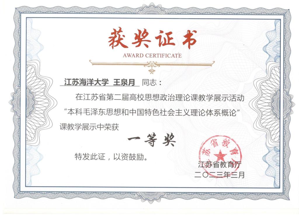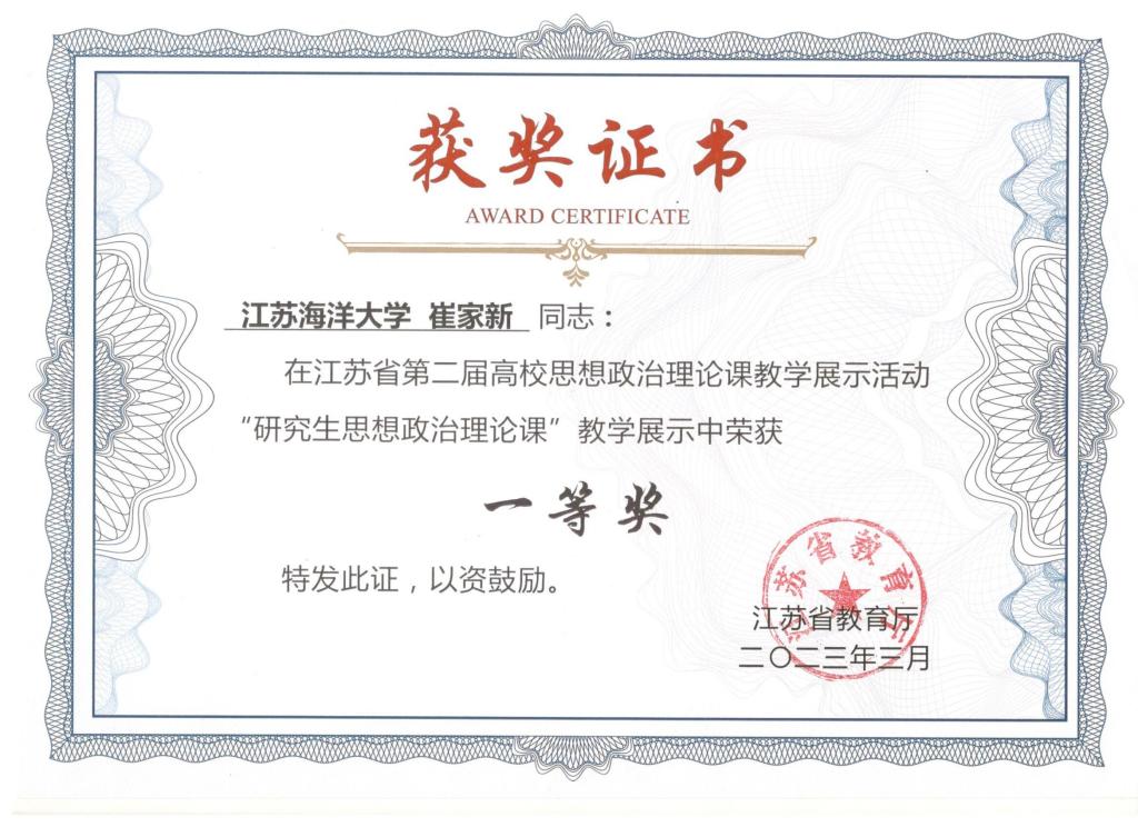 近五年,先后获批江苏省高校思想政治理论课教育教学改革创新示范点项2项,1人荣获江苏省高校微课教学比赛一等奖,2人在江苏省思想政治理论课教学展示中荣获一等奖,3人荣获二等奖。
