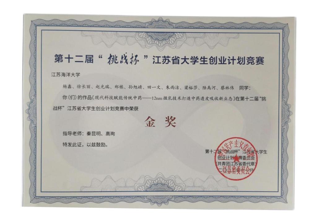 第十二届“挑战杯”江苏省大学生创业计划竞赛金奖