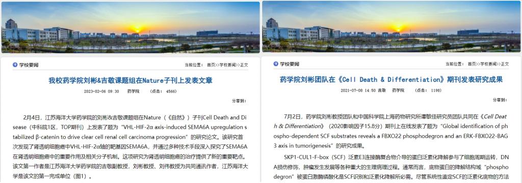 高端科研平台支撑高水平科研成果产出。第四次党代会以来,学院高度重视科研基金项目的申报工作,多措并举保障项目申报质量,取得较好成绩,其中2023年获批国家级项目5项,取得历史性突破。近年来,学院各类纵横向科研项目累计达50余项,资金总额达4500余万元,科研工作连续四年超额完成学校的年度目标任务。依托科研平台,师生累计发表高水平论文超270篇,授权专利超40项,秦昆明研究员先后获得2018年度江苏省科学技术进步奖二等奖、2020年度江苏省科学技术进步奖三等奖、2022年度重庆市科学技术进步奖二等奖,江苏特聘教授刘彬获2022年度江苏省杰出青年自然科学基金项目(150万元),科研团队于2023年和2021年依次在Nature旗下著名学术期刊《Cell Death & Disease》(中科院一区,TOP期刊)发表系列标志性成果,均以江苏海洋大学为第一完成单位和通讯单位发表,极大提高了药学学科的科研水平和学术影响力。