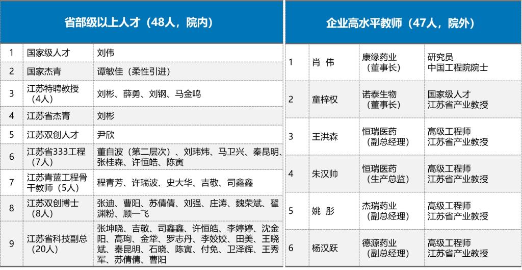 坚持“党管人才”原则,遵循“人才驱动”理念,积极搭建人才成长平台载体,着力引才、育才、留才、用才,不断创新人才工作模式,打造高水平专业人才团队。近年来,学院培育国家级人才1人,柔性引进国家杰青1人,入选江苏特聘教授4人,江苏省杰青1人、江苏双创人才1人、江苏省333人才工程7人、江苏青蓝工程骨干教师5人、江苏双创博士8人、江苏省科技副总20人,花果山英才计划双创团队1个,双创人才2人。聘任企业教师47人,其中包括中国工程院院士、康缘药业董事长肖伟,诺泰生物董事长、国家级人才童梓权,恒瑞药业副总经理王洪森,恒瑞医药生产总监朱汉帅,杰瑞药业副总经理姚彤,德源药业副总经理杨汉跃等一批知名的企业专家学者,累计获批江苏产业教授8名。