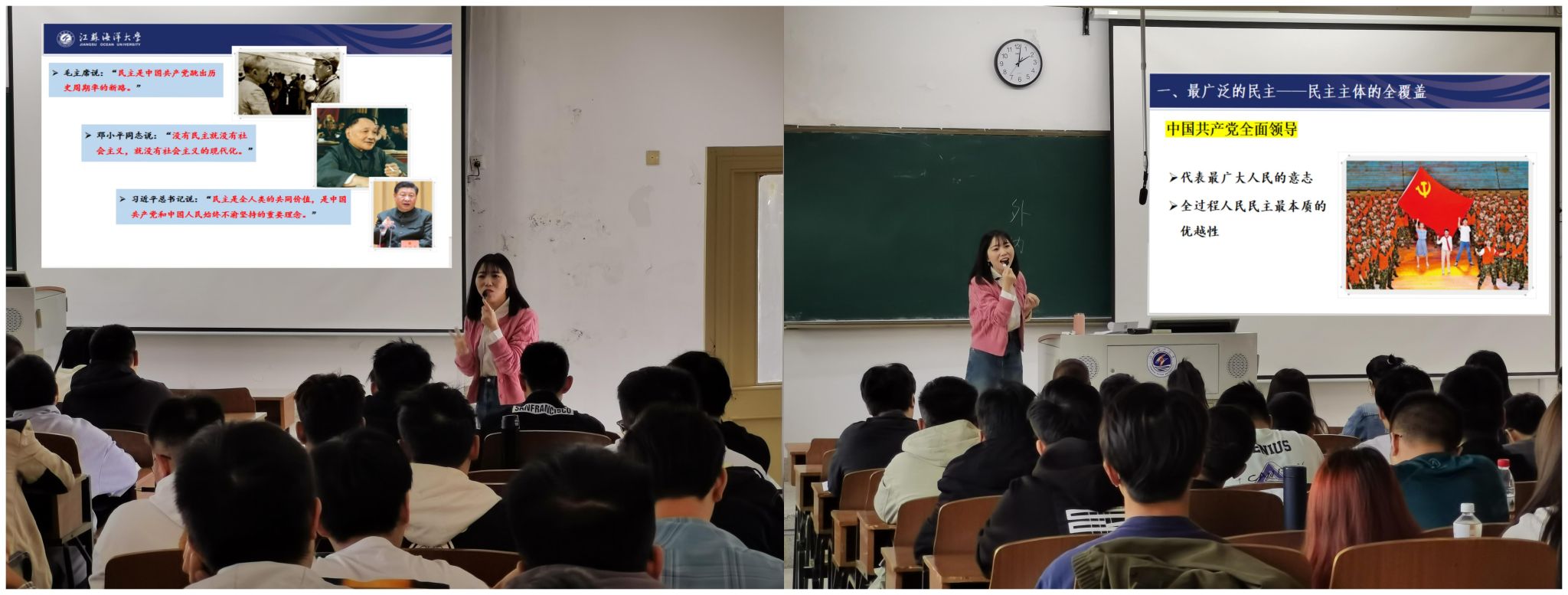 10月16日下午,马克思主义学院倪念念老师,在文达楼312教室讲授了“全过程人民民主”。通过将西方民主制度与中国民主制度比较分析,结合大学生参与民主生活经历,理论实践相结合,引导学生自主思考、深度参与课堂,增强社会主义制度优越性的政治认同、文化认同和情感认同。课堂中以丰富的视频资源、案例材料为支撑,利用对分易贯穿教学,打造互动式、沉浸式课堂,教学效果良好。