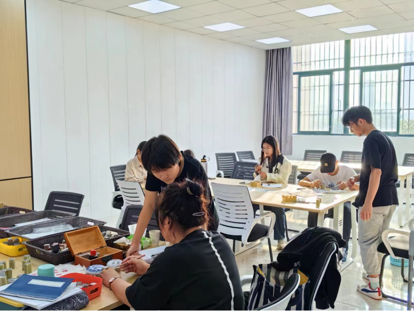 金石华彩,知白守黑,方寸之间,刀走凌云志,字形流云姿。在老师的精心指导下,同学们了解印章艺术具有物质文化和精神文化、实用价值和审美价值的双重性以及印章形成和发展与我们国家的民族、政治、经济、文化的密切关系。每期一个月左右的培训结束,同学们结业的印章作品虽然略显稚嫩,但是线条流畅,文字提顿起伏,各具特色。