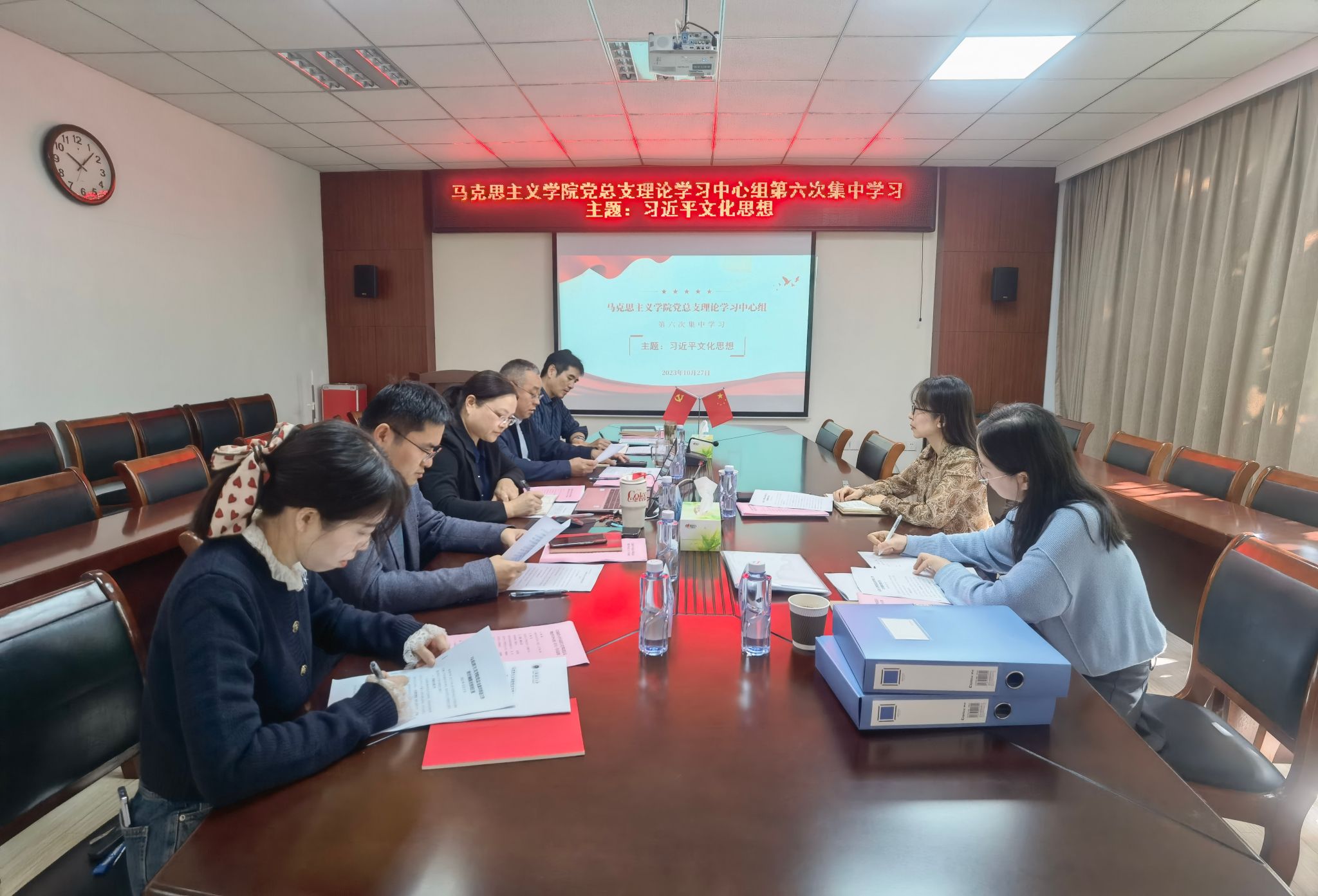 10月27日,马克思主义学院党总支理论学习中心组聚焦习近平文化思想主题,院长沈春梅领学并梳理了习近平文化思想形成的脉络和内在逻辑,全面解读了习近平文化思想的内涵和精髓、系统阐述了习近平文化思想的重要意义。马克思主义学院党总支书记韩振响作重点发言和总结,他表示,学习贯彻落实好习近平文化思想,要坚持学以致用,切实在深化内化转化上下功夫,切实与加强学院建设、提高思政课质量紧密结合起来。崔家新作重点发言,他提出思想政治课教师应当立足课堂,不断提高自身理论素养,践行好传播真理,铸魂育人的时代使命。金芙蓉在最后点评中指出,此次中心组理论学习组织周密,主题鲜明,紧扣中心,认识深刻,取得了明显的学习效果。她提出三点建议:一是深化理论武装,把握精髓要义。要坚持提高自身的理论功底,不断创新理论学习的形式,提升思政课的吸引力、感染力和说服力;二是明晰发展思路,落实发展目标。对标单位年度工作计划和任务,突出问题导向,落实具体发展举措。提升学院社会服务的意识和能力,主动对接相关职能部门,推动学院快速发展;三是坚持以上率下,强化责任担当。提升意识形态工作的能力和水平,筑牢思想防线,发挥马克思主义学院示范、引领作用,将所学、所思、所得的成果辐射到全校师生。