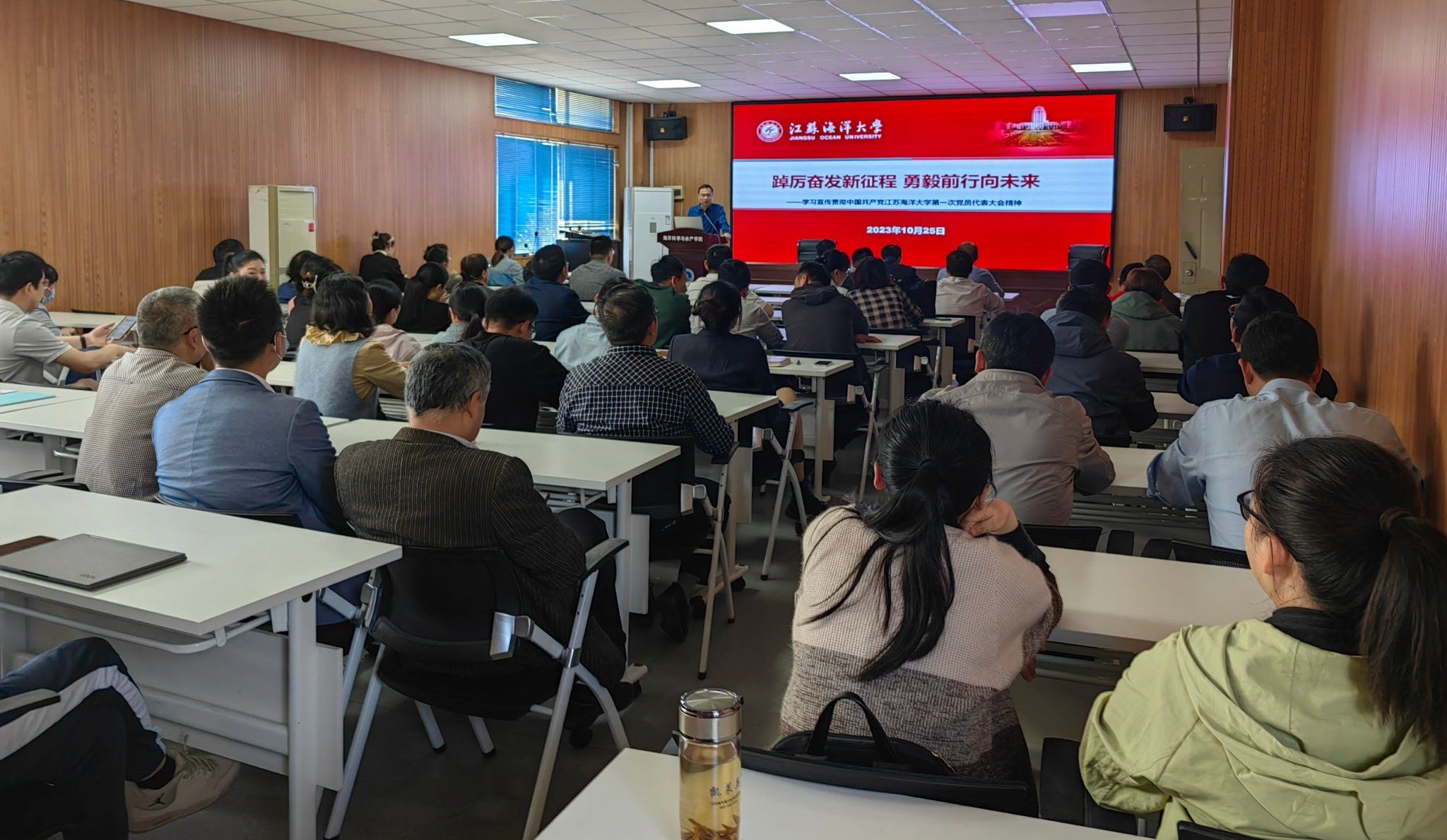 为深入学习贯彻学校党代会精神,10月25日,海洋科学与水产学院党委书记黄金虎为海洋科学与水产学院全体教职工宣讲校第一次党员代表大会精神。