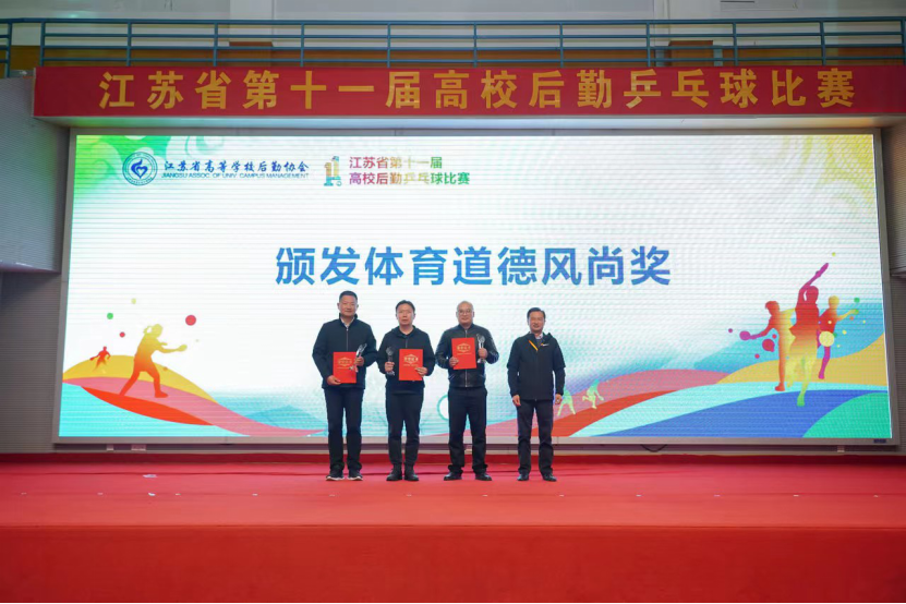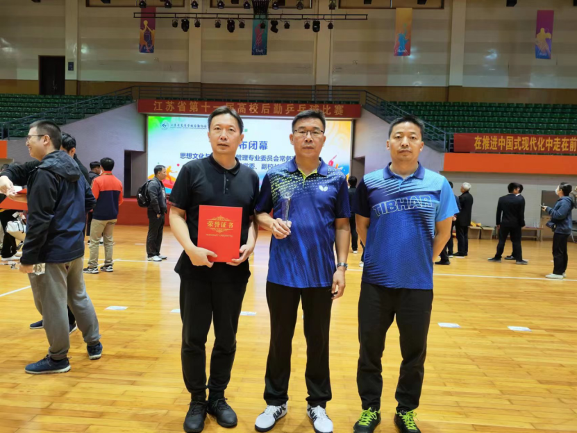11月11日,江苏省第十一届高校后勤乒乓球赛在南京工业职业技术大学举行。我校以副校长郑利军为领队兼队员以及冯源、汤昌林组成的代表队在比赛中弘扬体育精神,团结协作,顽强拼搏,取得第七名的历史突破成绩,并荣获“体育道德风尚奖”,在全省高校中树立了良好形象。