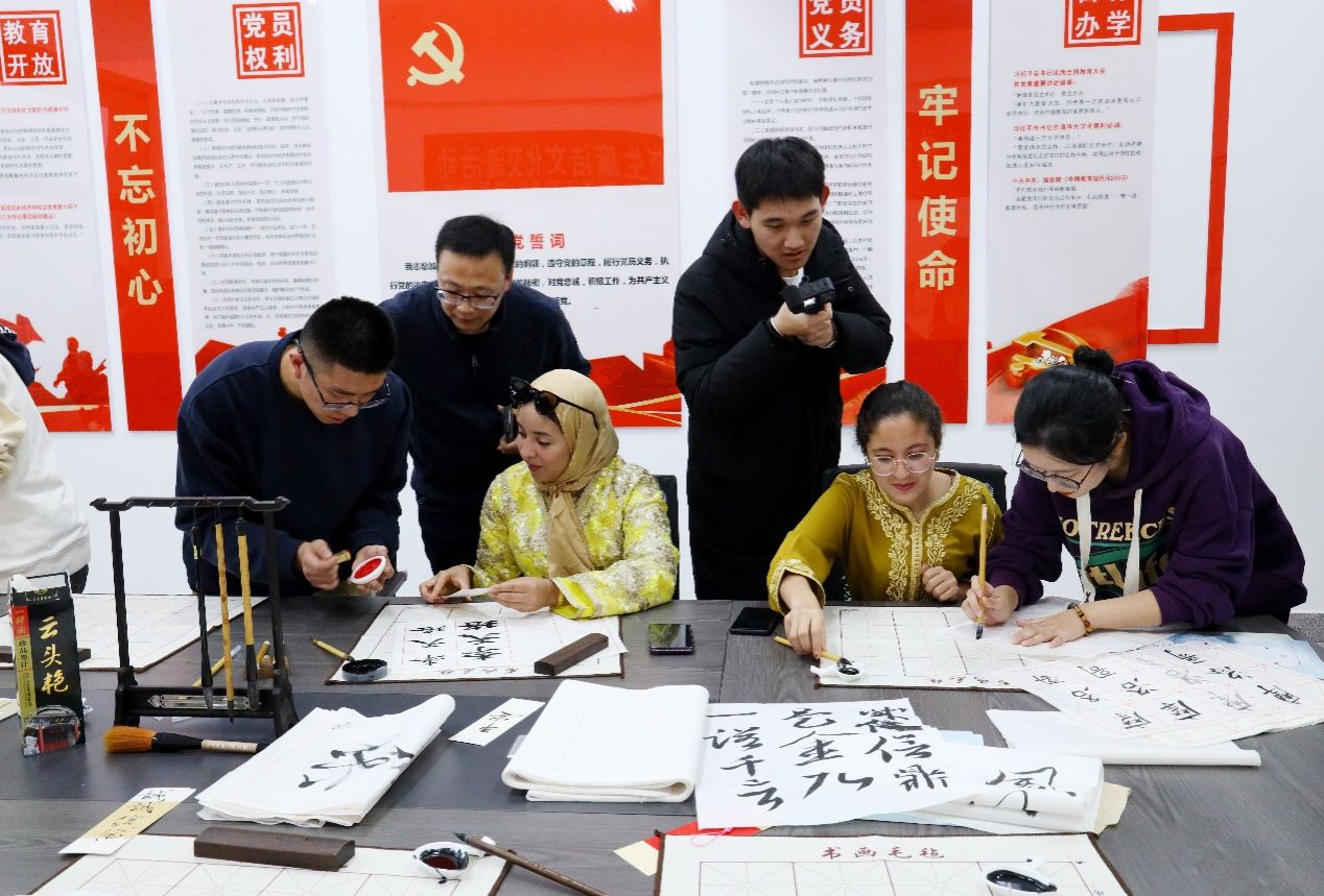 学院的书画爱好者们以诚信诗词、水墨画为载体,将思想和审美融于笔端,在书签、卷轴、宣纸上描绘中华文明之美。越南、老挝、蒙古留学生现场展示了用本国文字书写的诚信主题作品,并用汉语讲解其书画作品所蕴含的母语文化寓意。来自摩洛哥、科特迪瓦等国的留学生们学习用毛笔书写自己的国家名字、诚信隽语、廉洁警句,品多元文化之韵、赏交流互鉴之美。学院“国学社”孙国丰向舒小平院长赠送书法作品,表达学院师生对舒院长躬耕教坛、立德树人的感激之情。八十多件书画作品由作者们盖章后赠送给参加活动的中外师生,浓厚的廉洁文化气息为书香校园增添了一抹靓丽的风景。那些或高古率真,或雅致秀美的国学作品彰显了书画连接心灵、沟通世界的作用,拉近了中国与世界的距离。