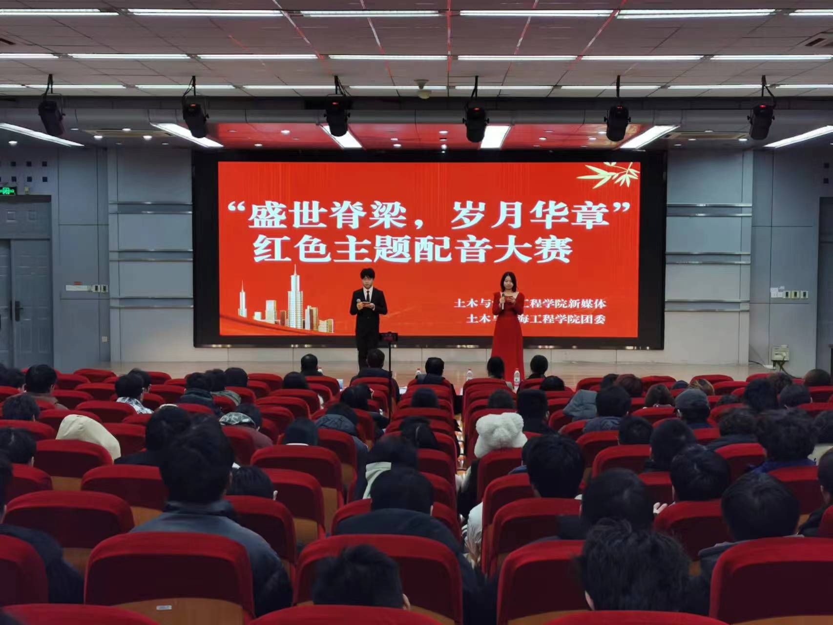 为深入学习贯彻党的二十大精神,培育大学生的社会主义核心价值观,涵育大学生的爱国主义情怀,11月29日晚,土木与港海工程学院于艺术报告厅举办了“盛世脊梁,岁月华章”红色主题配音大赛。本次大赛由土木与港海工程学院新媒体发展中心和团委主办,邀请了校党委宣传部副部长陈晓艳、土木与港海工程学院党委副书记魏学庆、校党委办公室秘书科科长包家官、校团委组宣部部长周小晓、土木与港海工程学院团委书记卞辉担任评委,来自各学院的8支队伍进入决赛。