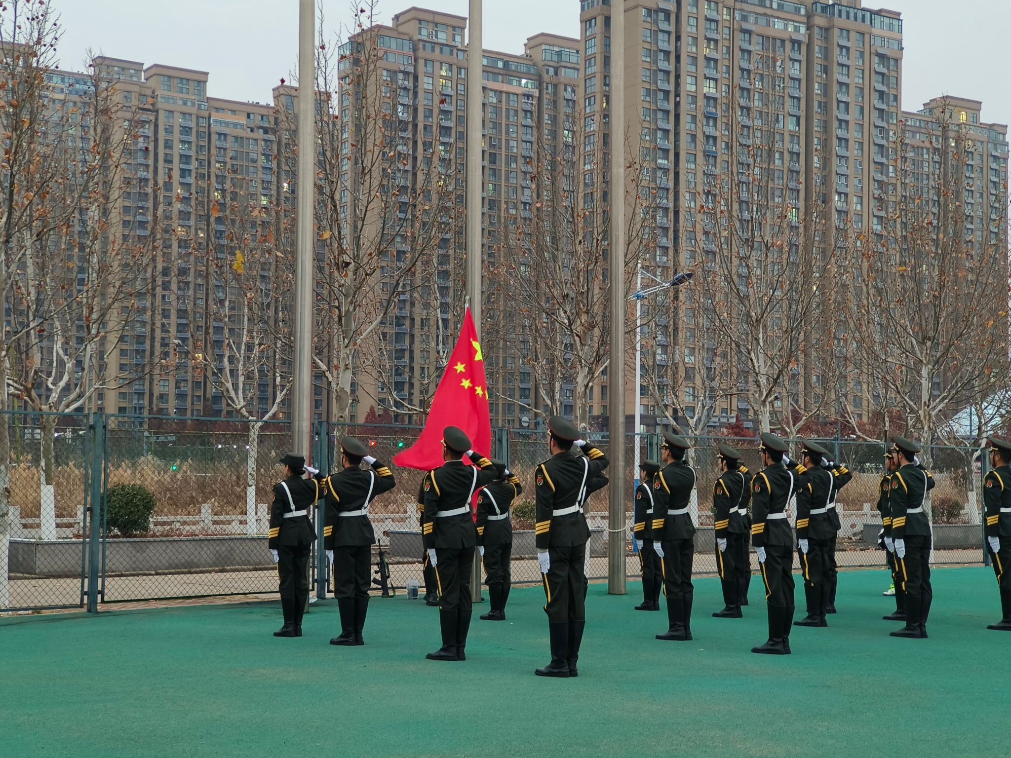 早7时整,全体师生在东体育场庄严肃立。伴随着雄壮的《义勇军进行曲》,鲜艳的五星红旗冉冉升起,师生齐唱国歌,向国旗行注目礼。
