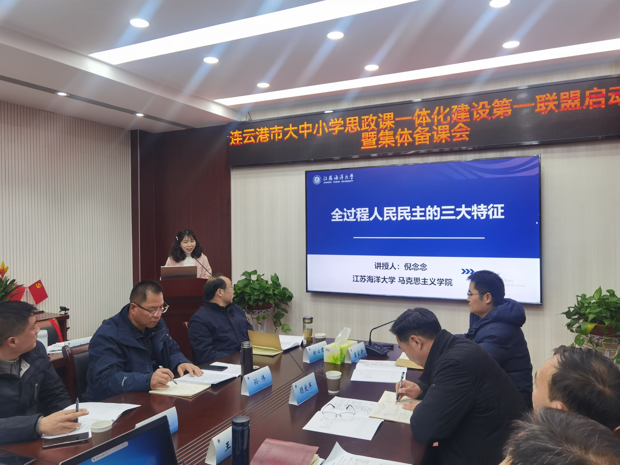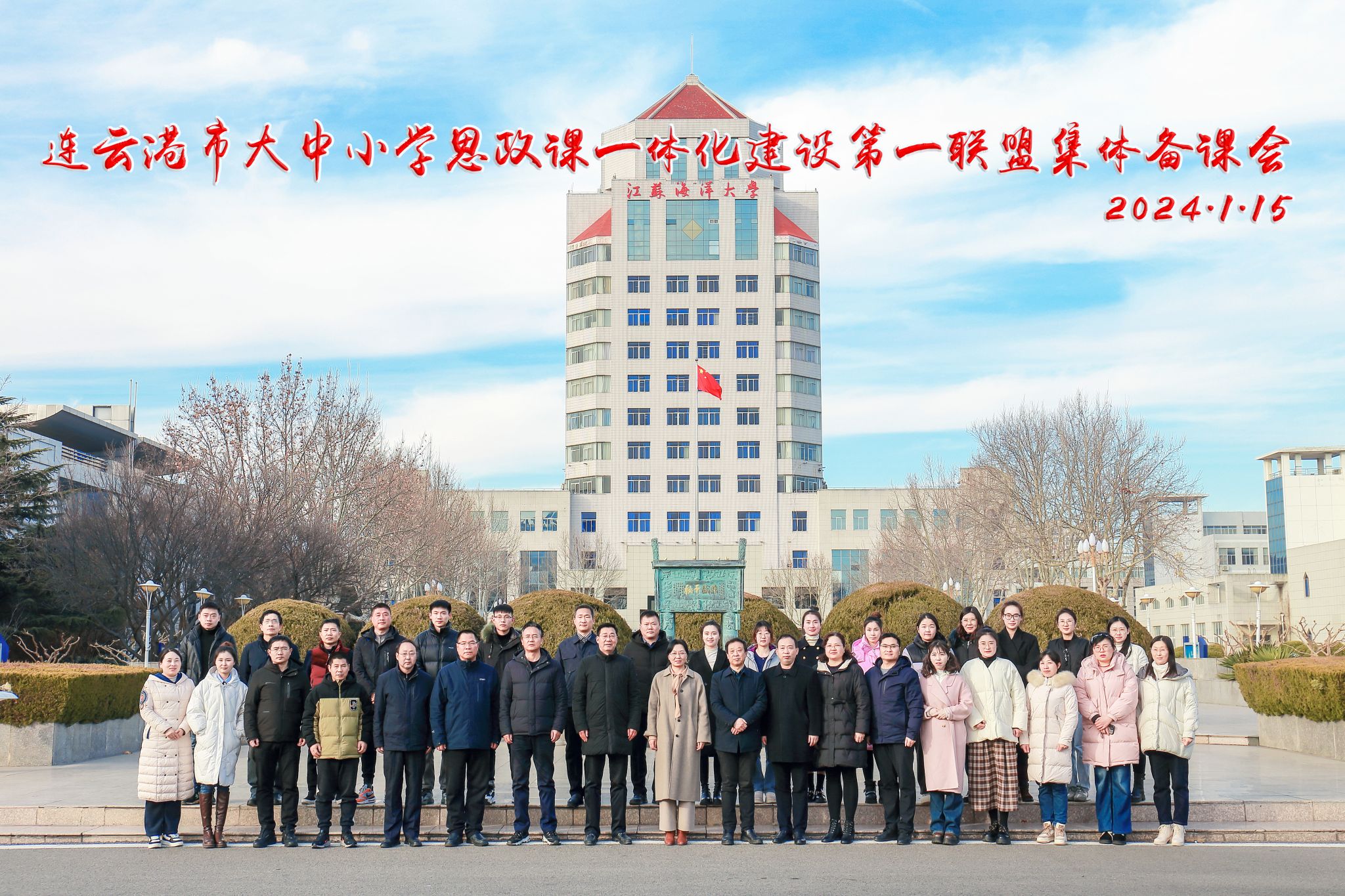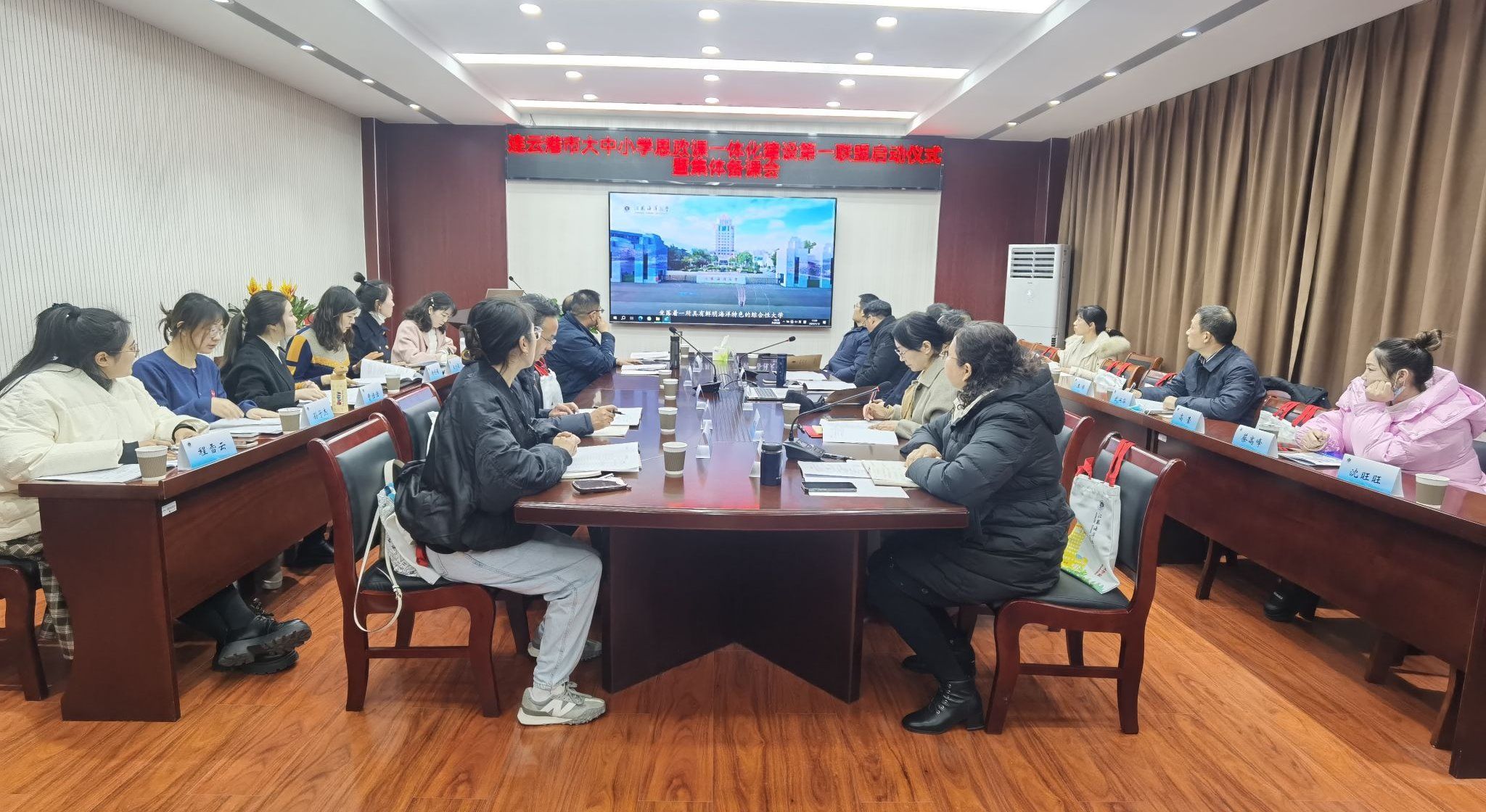 1月15日下午,连云港市大中小学思政课一体化建设第一联盟启动仪式暨集体备课会在我校召开。江苏省大中小学思政课一体化建设专家指导委员会主任委员、中国矿业大学教授、博士生导师池忠军,连云港市大中小学思政课一体化建设指导委员会专家指导组副组长、连云港市教科所教授姚玉琴,校党委常委、宣传部部长王波以及连云港市大中小学思政课一体化建设第一联盟的8所大中小学相关领导、教师代表40余人参加了活动。