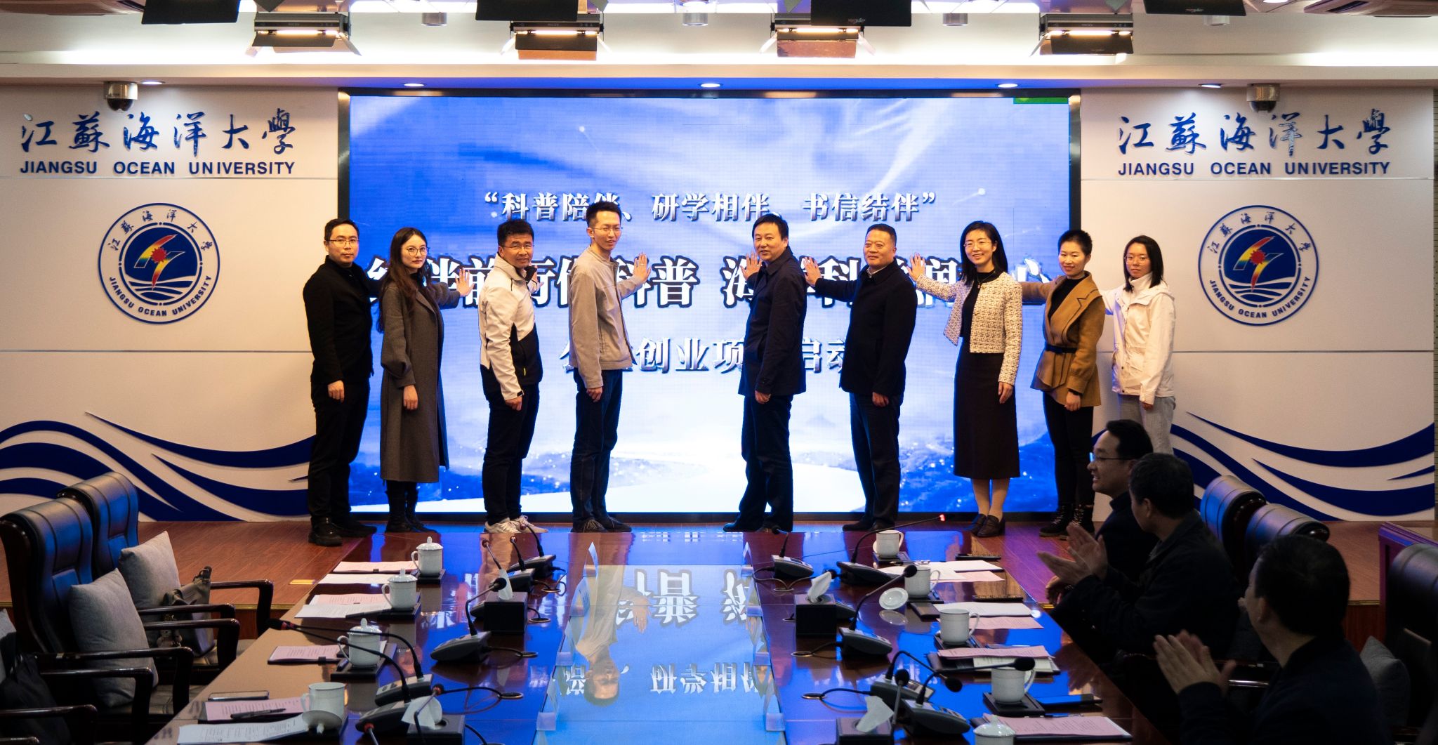会上,徐军田、王华、褚士明、王帆、孙强、黄玺澄、陈宣霖、夏远娟、吉人共同上台启动江苏海洋大学“结伴前行做科普 海洋科学润童心”科普类公益创业项目。