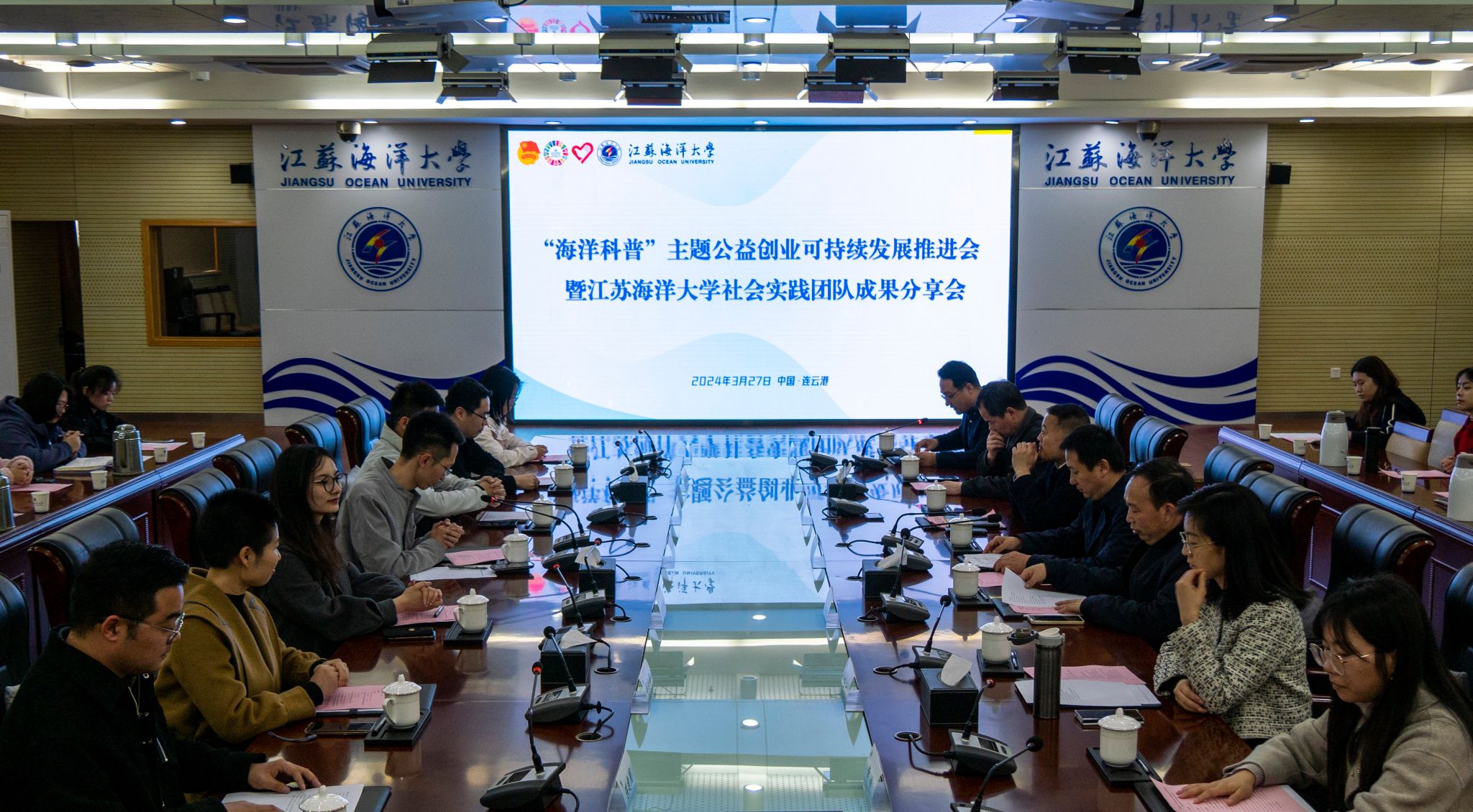 为展示我校社会实践项目发展成果,推进各公益创业项目的可持续发展,江苏海洋大学“海洋科普主题”公益创业项目可持续发展推进会暨社会实践团队成果分享会于3月27日14:30在东海厅举行。副校长徐军田,党委常委、宣传部部长王波,江苏省妇儿基金会副理事长王华,连云港市科协副主席褚士明,连云港团市委副书记王帆,南京科技馆副馆长孙强,江苏省同读好书共芸窗研究院资助部部长黄玺澄,南京市结伴共芸窗社会工作服务中心副理事长陈宣霖,南京科普教育基地应用协会秘书长夏远娟,江苏省科普服务中心项目主管吉人,校团委副书记黄媛以及各实践团队指导老师、学生代表共同参会。会议由校团委书记黄吉庆主持。