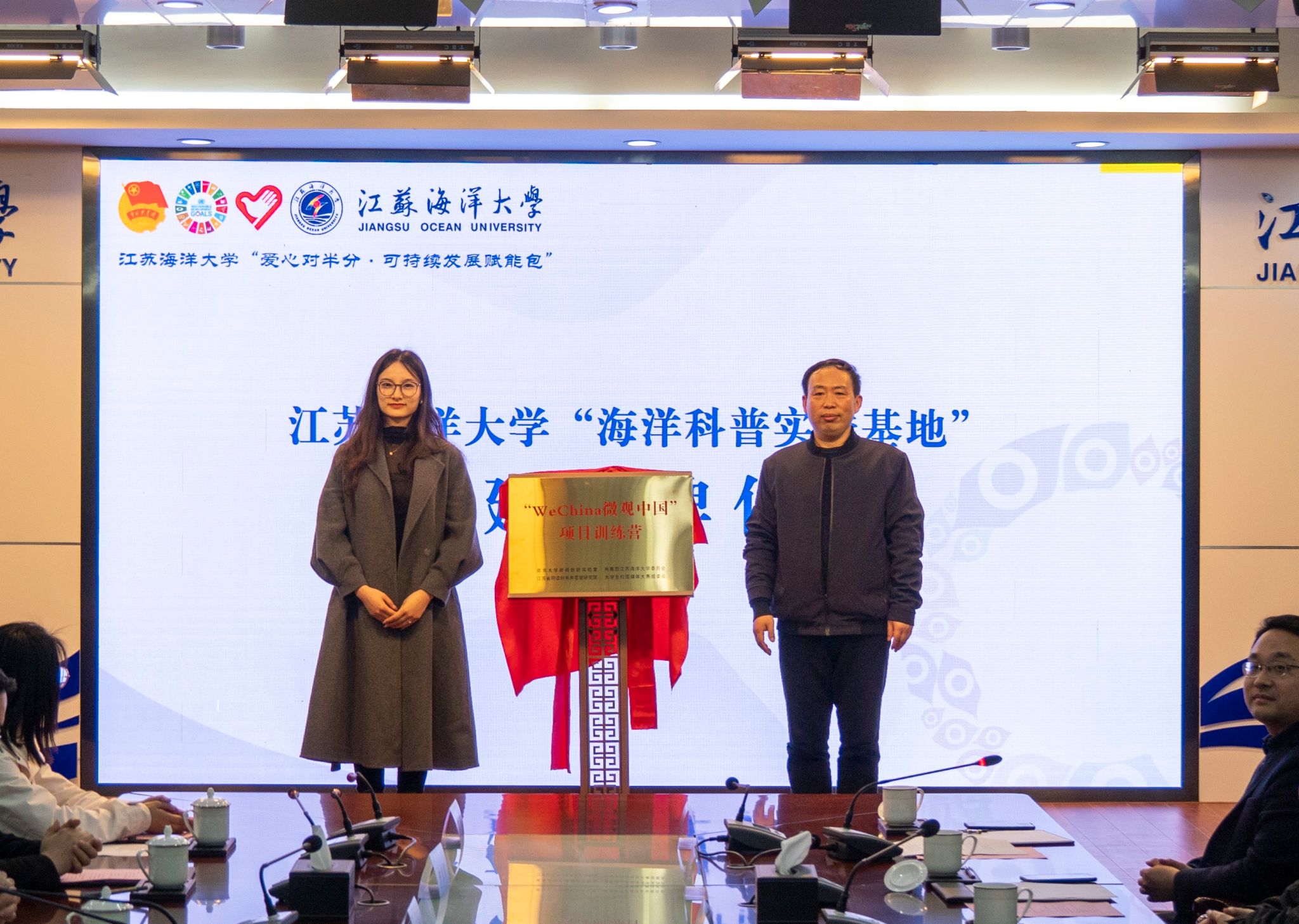 王波为首批“阵地合作、产品合作、人才合作”公益支持单位代表陈建周颁发江苏海洋大学公益创业导师聘书,与黄玺澄共同揭牌“WeChina微观中国”项目训练营。