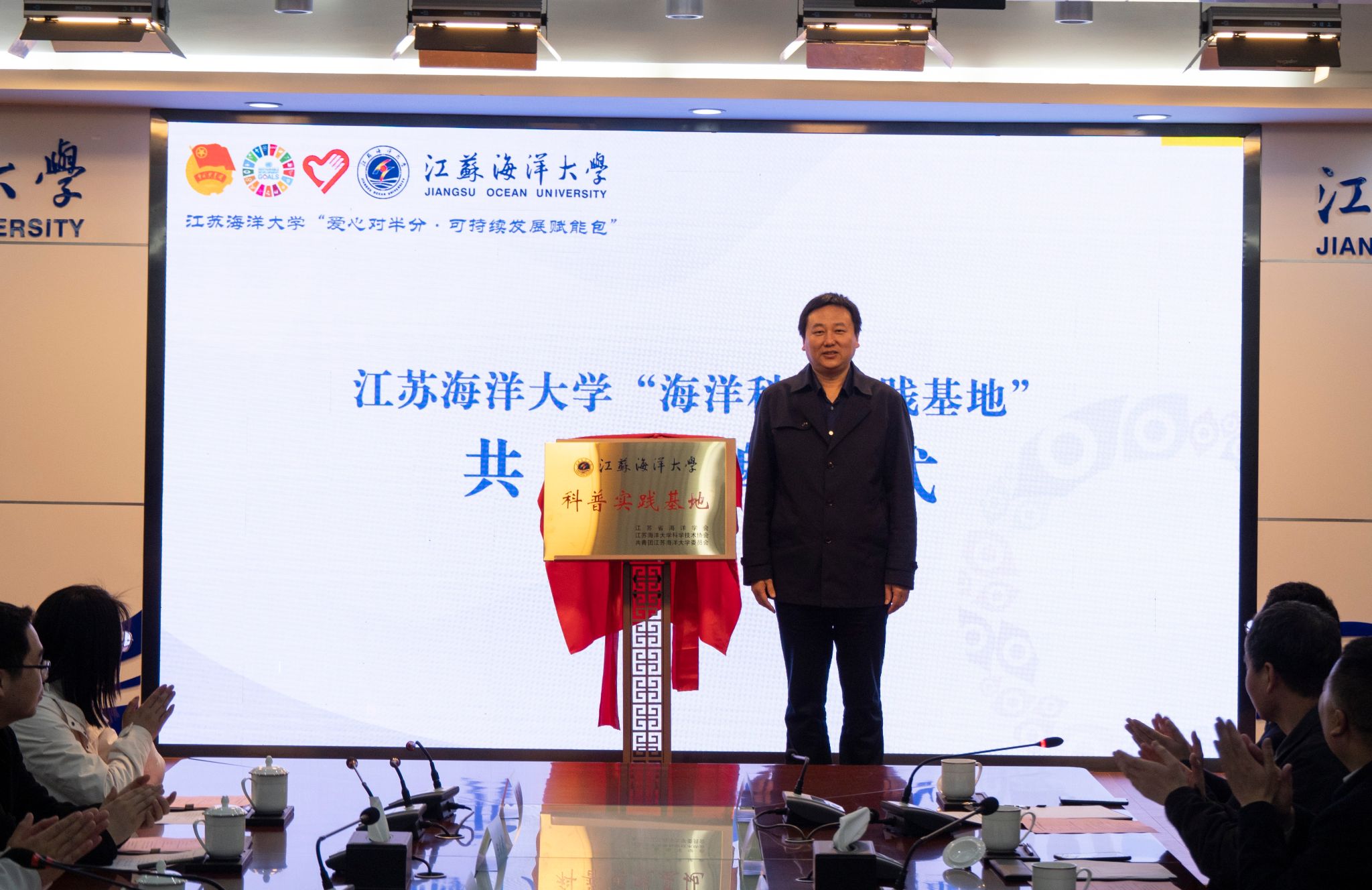 徐军田为江苏省海洋学会与学校共建的“科普实践基地”揭牌;王波、孙强、夏远娟、陈宣霖为南京、连云港两地共建的江苏海洋大学“科普实践基地”揭牌;褚士明、王帆为市科协、团市委、校团委共建的苏海洋大学“科普实践基地”揭牌。