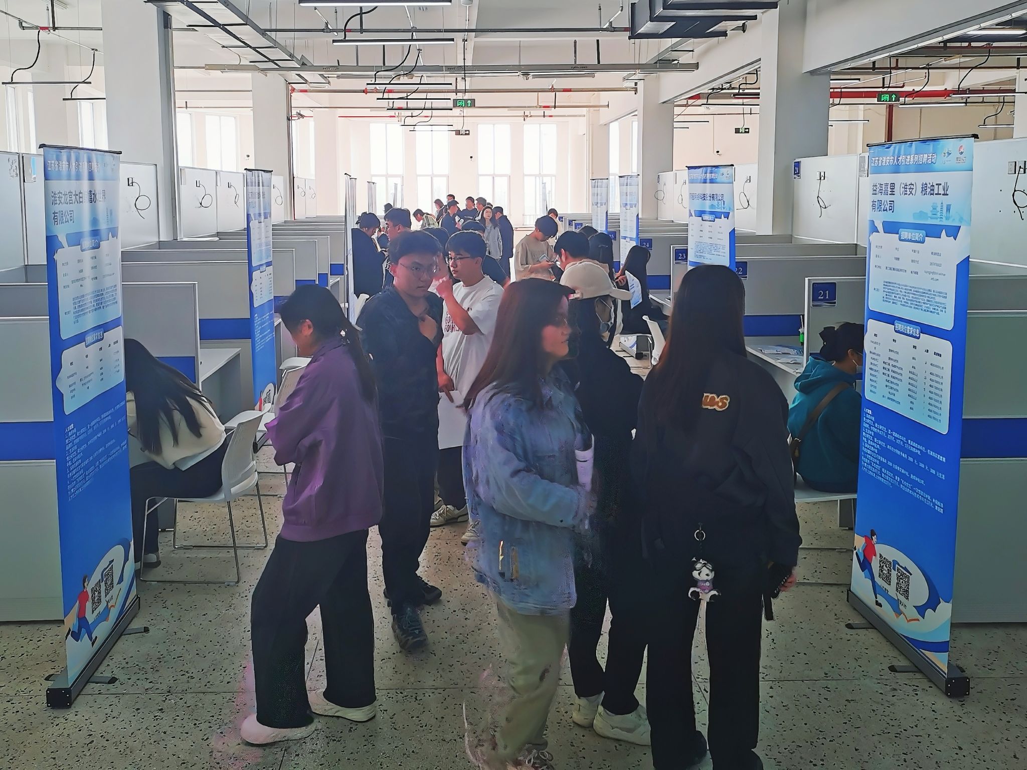 此次招聘会吸引了众多毕业生前来应聘。现场人头攒动,气氛热烈,学生们手持简历,穿梭于各个招聘展位之间,许多招聘展位前也排起了长队,应聘学生与用人单位进行深入交流,了解岗位需求、薪资待遇等具体情况。另外,此次招聘会还设置了淮安地区人才政策宣传展区,向学生们展示淮安市的人才引进政策、就业创业扶持措施等。