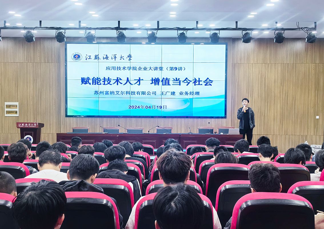 4月19日下午,应用技术学院在多功能报告厅开展以“赋能技术人才增值当今社会”为主题的第九期企业大讲堂。苏州富纳艾尔科技有限公司业务经理王广建应邀主讲,学院2021级对口单招机械类、电气类专业学生参加讲座。自2023年开展以来,“企业大讲堂”聚焦企业新技术、新产品、新业态发展主体,向学生传输和了解企业最新技术的平台,为学生专业学习与职业发展提供针对性指导,深受广大学生欢迎和喜爱。