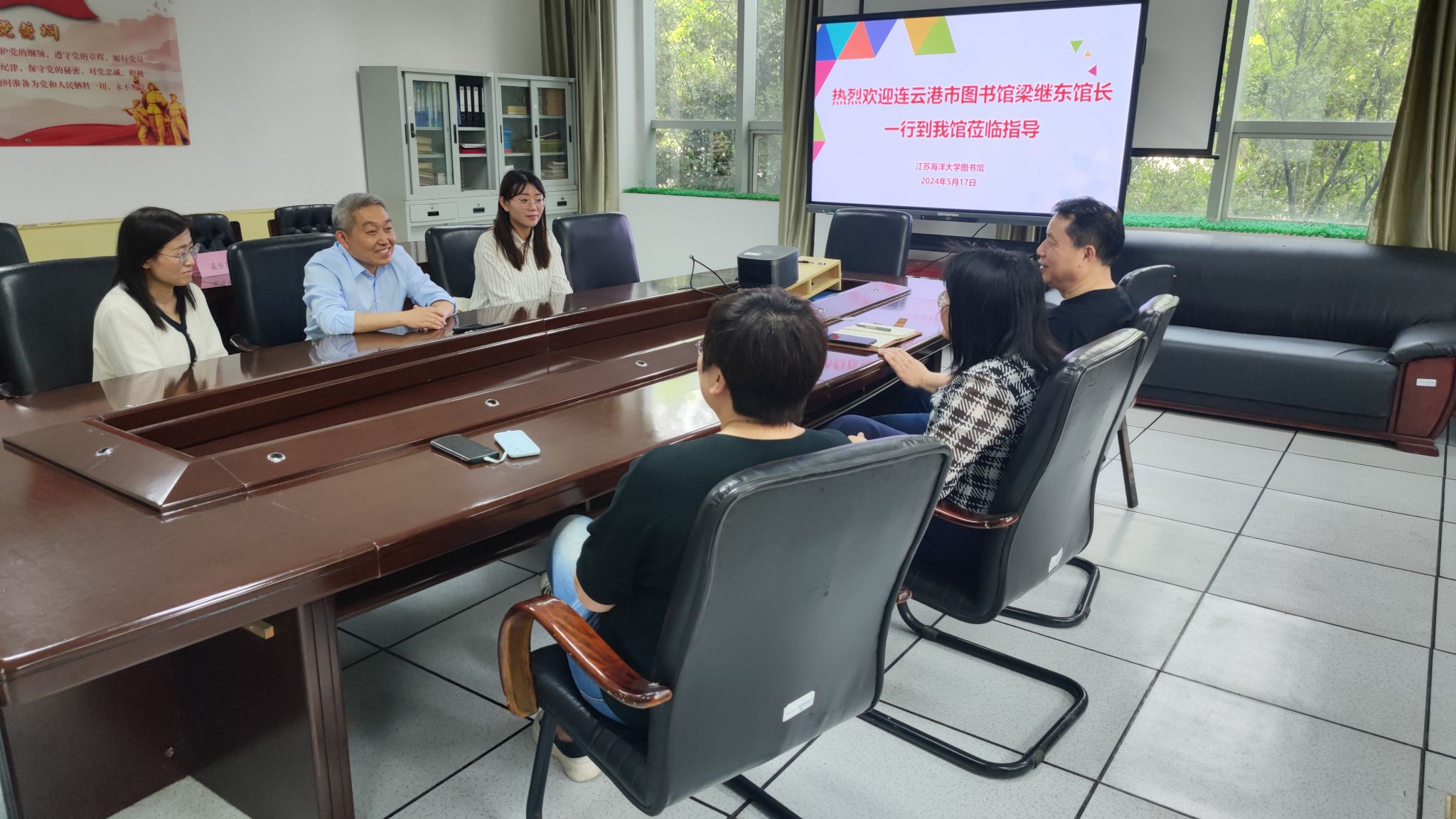 5月17日下午,连云港市图书馆馆长梁继东一行来我校图书馆进行考察交流。我校图书馆党委书记艾华,副馆长田为付、胡昌芹热情接待了梁继东一行,对梁继东一行的到来表示热烈欢迎,双方就图书馆管理、资源建设、服务创新等方面进行了深入交流。