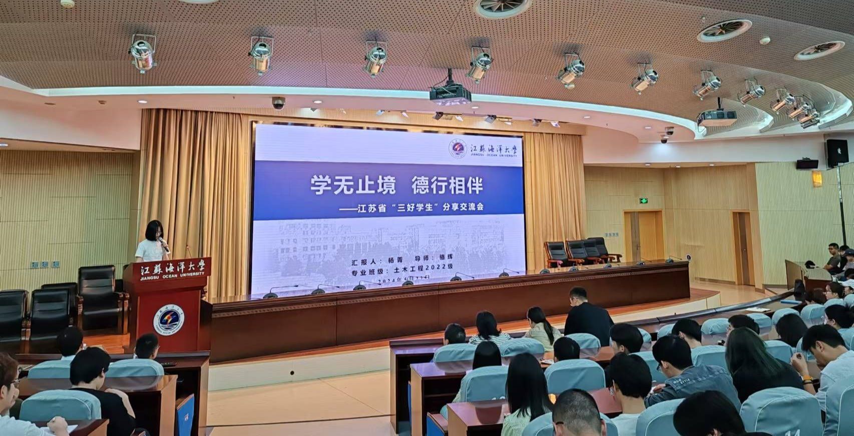 江苏省“三好学生”称号获得者——土木与港海工程学院2022级研究生杨菁以《学无止境 德行相伴》为题,从“崇德向党 秉正撷英——政治思想”“勤学善思 钻研无惧——学业科”“心怀热忱 向光而行——日常生活”“力行践知 笃行不怠——社会实践”四个方面分享了自己的学习科研生活经验和感受,强调制定学习计划、合理安排时间的重要性,鼓励大家要多向导师学习请教、多和同学交流讨论,以免陷入孤立思考的误区。该生荣获一等学业奖学金1次、二等学业奖学金1次、2022-2023学年“校优秀研究生”称号,发表北大中文核心论文1篇(一作)、SCI论文3篇;荣获2022年江苏省大学生给排水(环境工程类)创新、创业与实践第四届“瑞洁特杯”竞赛论文类团体三等奖(排名第1)等奖项3项,积极参加社会实践和志愿服务。