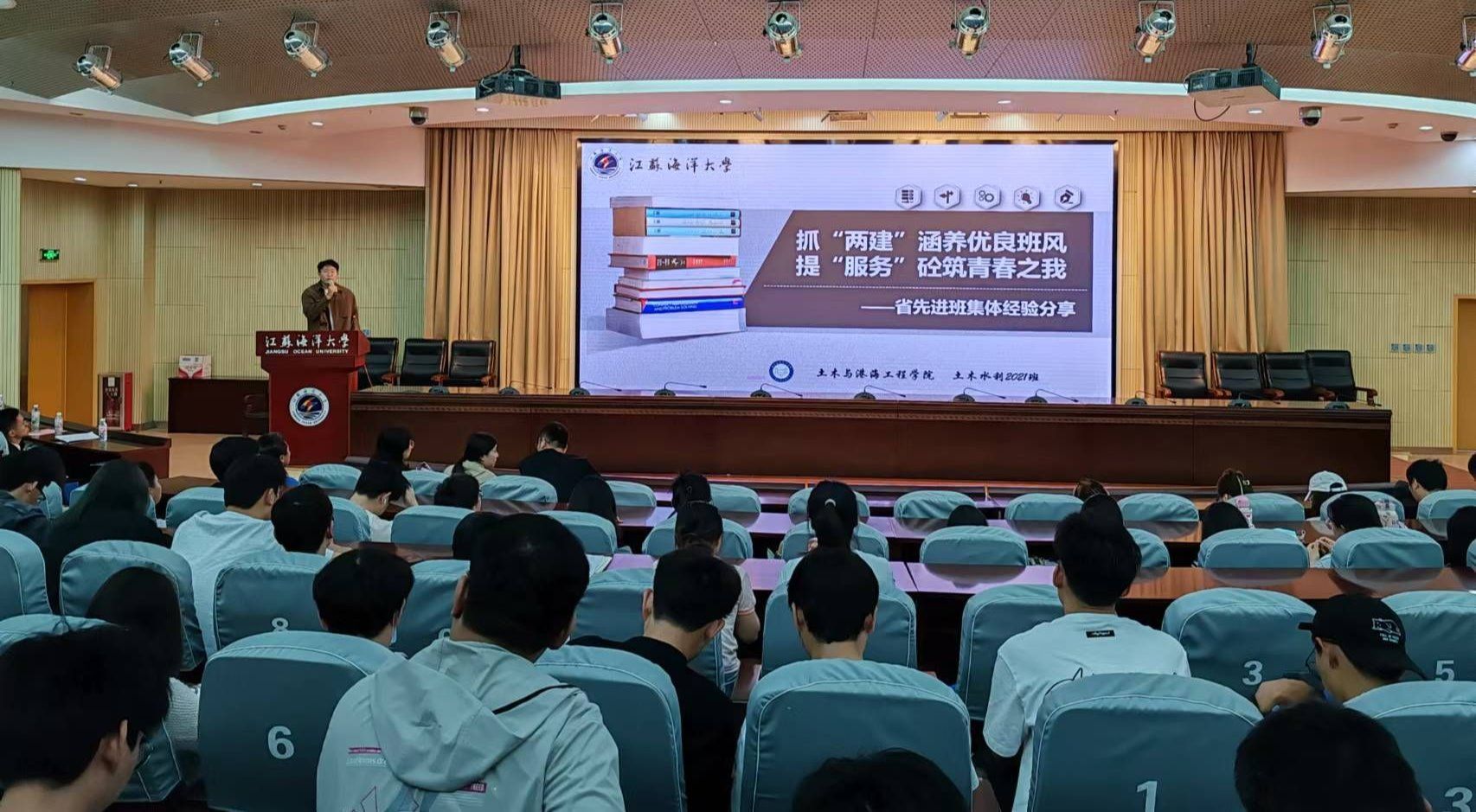 江苏省”先进班集体”——土木与港海工程学院土木水利研究生2021班班长梁帅作为代表以《抓“两建”涵养优良班风 提“服务”砼筑青春之我》为题进行分享,介绍了班级建设的经验和成果,强调了班级凝聚力和集体荣誉感培育的重要性,认为一个团结、积极向上的班集体能够为同学们提供良好的学术氛围和精神支持。该班是一个团结、进取的集体,班风、学风优良,科研成果丰硕,共计发表论文20篇,其中SCI论文5篇、北大中文核心2篇、省级期刊共13篇;获得专利共计37项,其中发明专利共授权11项、实审19项、实用新型专利共授权7项;研究生为主持人立项课题项目共计5项;班级荣获集体荣誉共计8个,其中国家级1个、省级3个、校级2个、院级2个;学生个人荣誉19项,其中省级荣誉9项、市级荣誉3项、校级荣誉7项;英语四级通过率86.84%(400分以上100%)、六级通过率44.74%;积极参加社会实践及志愿服务,其中“聚焦农房 赋能安全”社会实践团队荣获“2022年江苏省社会实践优秀调研报告”、江苏省研究生社会实践和志愿服务“十佳研究生团队”提名奖,“我当‘鲁班’来诊断 智能鉴定宜居行”实践团队荣获“2023年江苏省社会实践优秀团队”等,多名同学荣获连云港市海州区疫情防控优秀志愿者和校疫情防控优秀志愿者;积极开展社会主义核心价值观教育、科学道德与学术规范教育活动,成效显著;班级成员在校、院、班担任学生干部达到29人次。