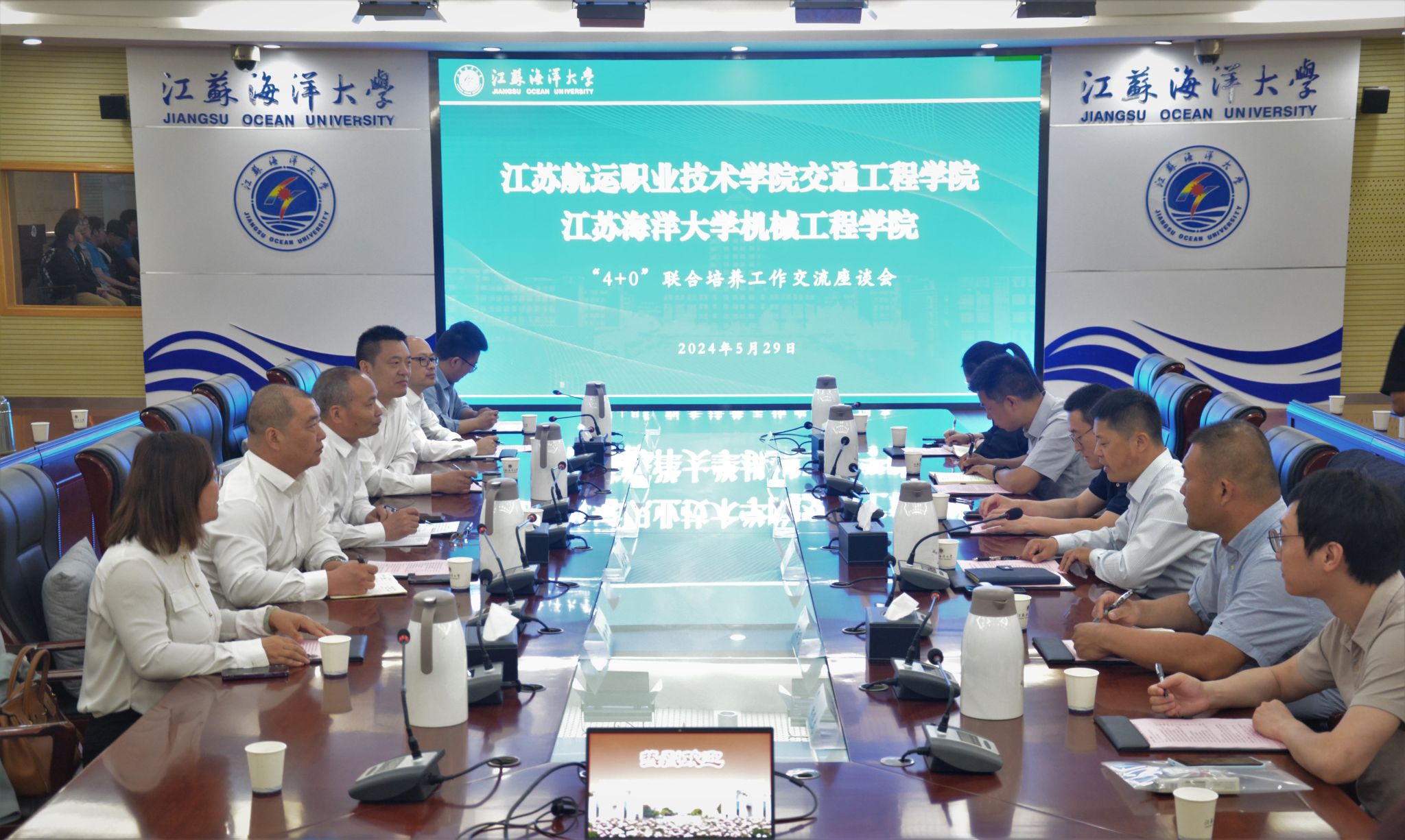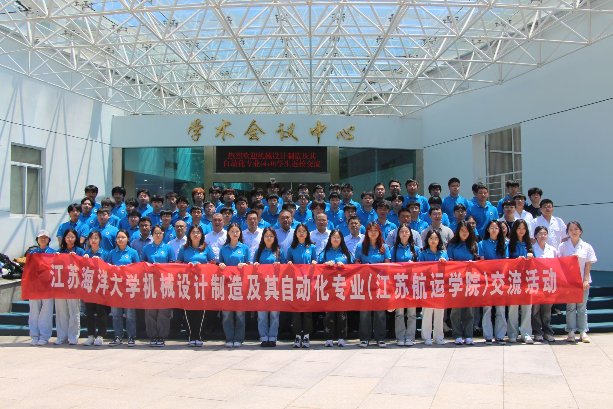 会上,与会师生共同观看了江苏海洋大学宣传片《风从江海来》。张元良对来访师生一行表示热烈欢迎,并从发展历程、党建思政、人才培养、学科建设、科学研究、师资队伍、实践条件等方面详细介绍了机械工程学院的基本情况,他指出,“4+0”班学生有着两个母校的特殊身份,希望在两校领导及教师的共同关注下,给予学生双倍支持和双份温暖。杨忠介绍了交通工程学院的办学历史、特色专业、“4+0”项目运行情况及所取得的成绩,希望在党建、学科等领域与我校深入交流,共同为“4+0”班学生的成长成才保驾护航、创造条件。自由交流环节,双方师生就“4+0”学生的联合培养、学科竞赛、考研就业等具体事项进行了深入交流。会后,全体师生在学术会议中心门前合影留念。