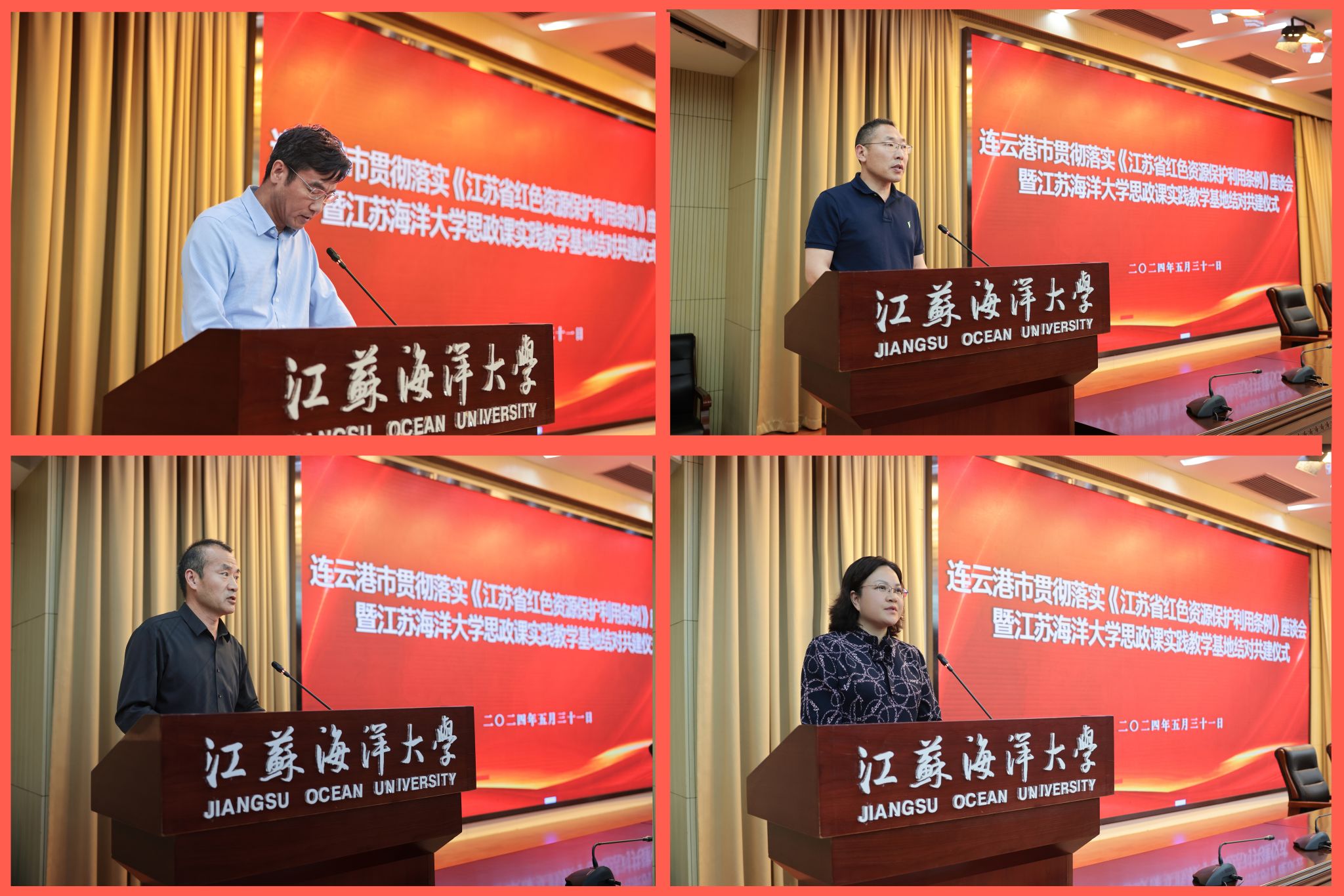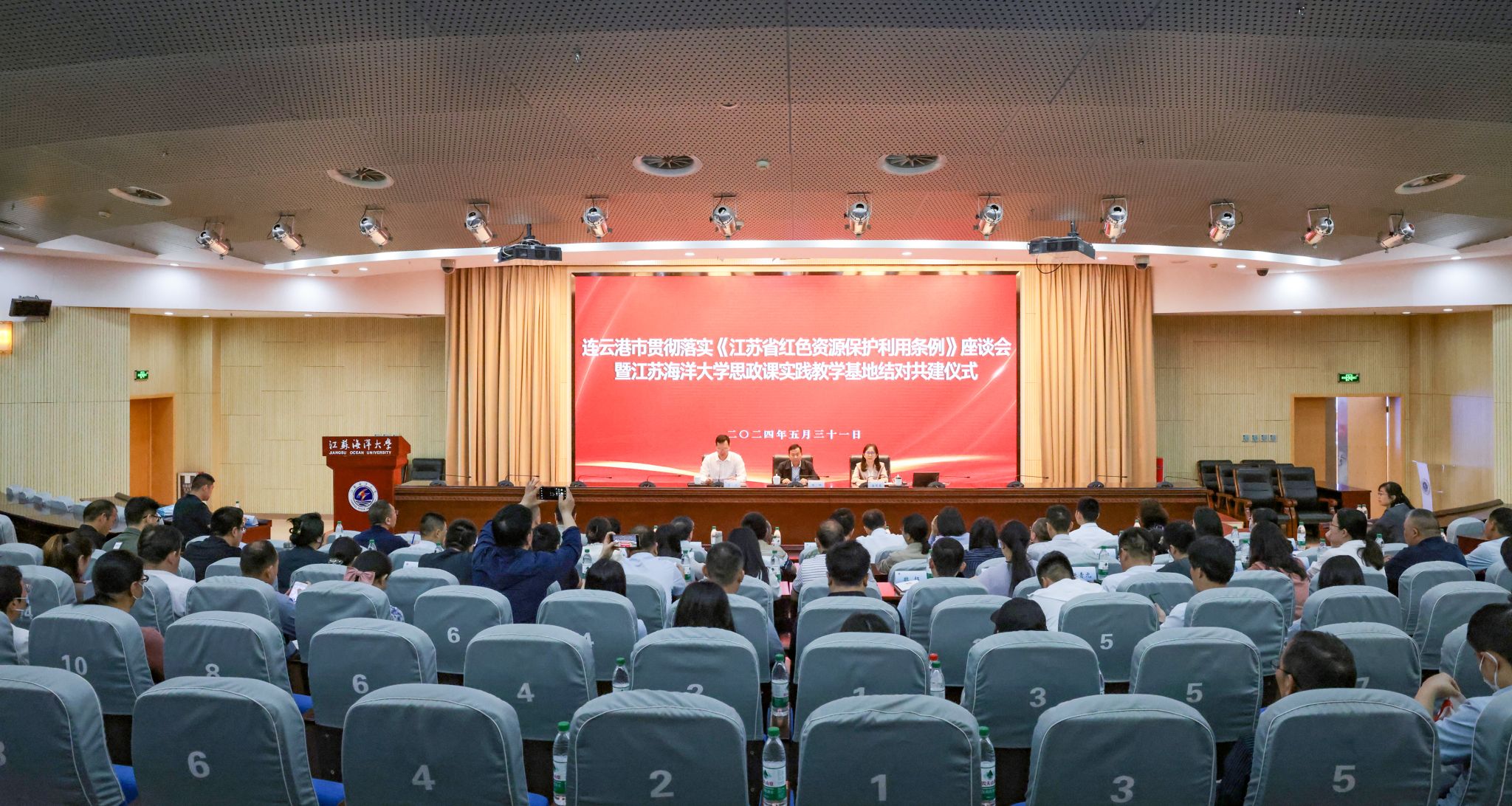 5月31日下午,《江苏省红色资源保护利用条例》座谈会暨江苏海洋大学思政课实践教学基地结对共建活动在我校会议中心黄海厅举行。校党委常委、副校长金芙蓉,省委宣传部宣传教育处(国防教育处)二级调研员陈辉,校党委常委、宣传部部长王波出席活动。活动由连云港市委宣传部副部长、市新闻出版局(市版权局)局长李武主持。连云港市相关职能部门负责人及连云港市国家级、省级爱国主义教育基地、国防教育基地负责人,马克思主义学院全体教师及学生代表100余人参加了活动。