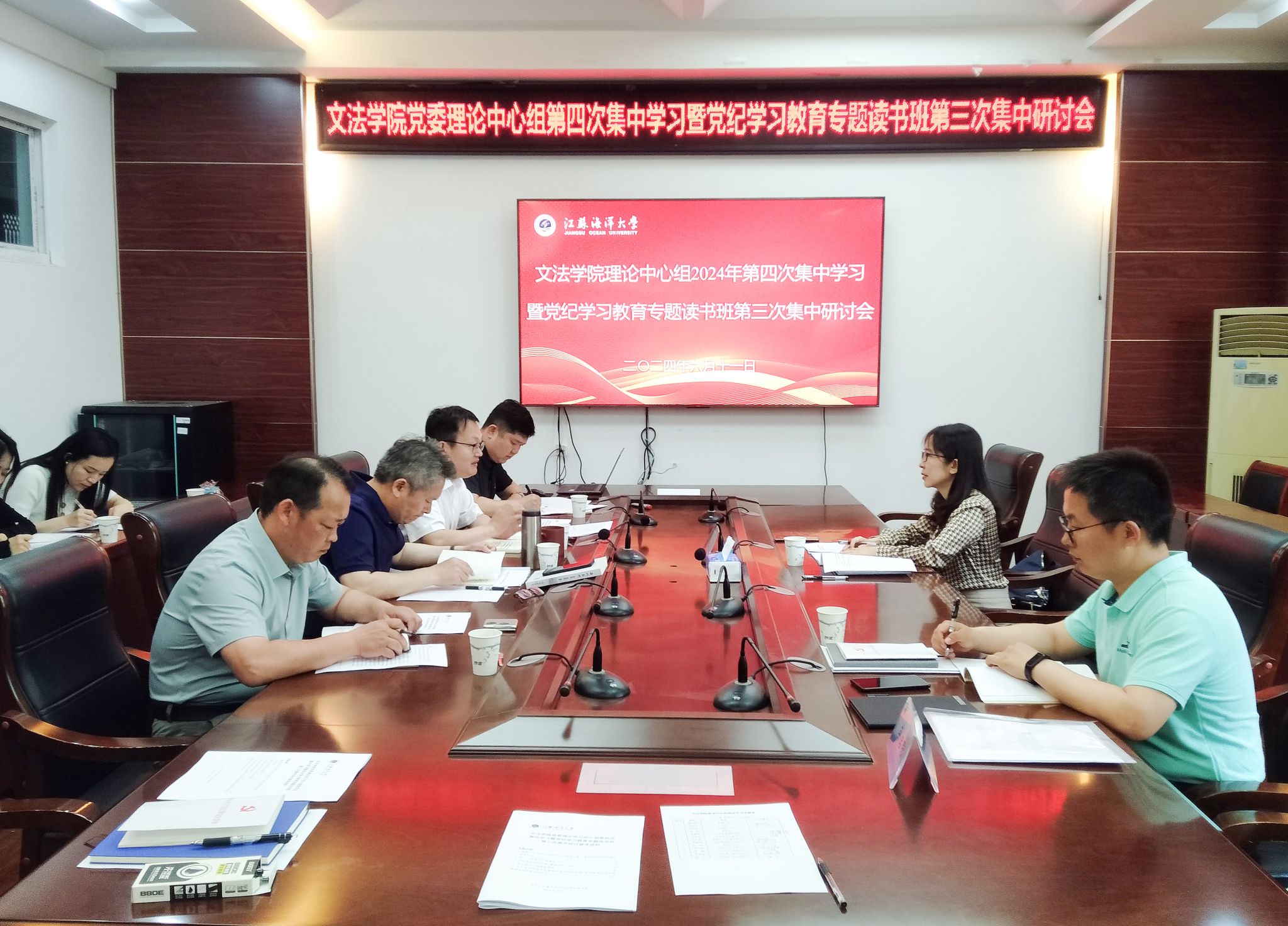 6月11日,文法学院党委召开理论学习中心组第四次集中学习暨党纪学习教育专题读书班第三次集中研讨会。党政办主任张建领学《中国共产党纪律处分条例》第七章内容,院长吴明忠对《中国共产党纪律处分条例》第七章进行整体解读,新闻广告系党支部书记邱立楠、公共管理系党支部书记杨殿闯依次领学了党的组织纪律建设相关内容。学生第一党支部书记赵亚婷领学了《习近平关于应急管理的重要论述》。副院长兼纪律委员颜金、党委副书记王国银分别做了重点发言。党委书记魏范青剖析了违纪典型案例、解读了江苏省高校党纪学习教育工作主要精神,布置近期党纪学习教育主要工作,推进党纪学习教育走深走实。与会人员还共同观看了《安全生产月主题宣传片》。