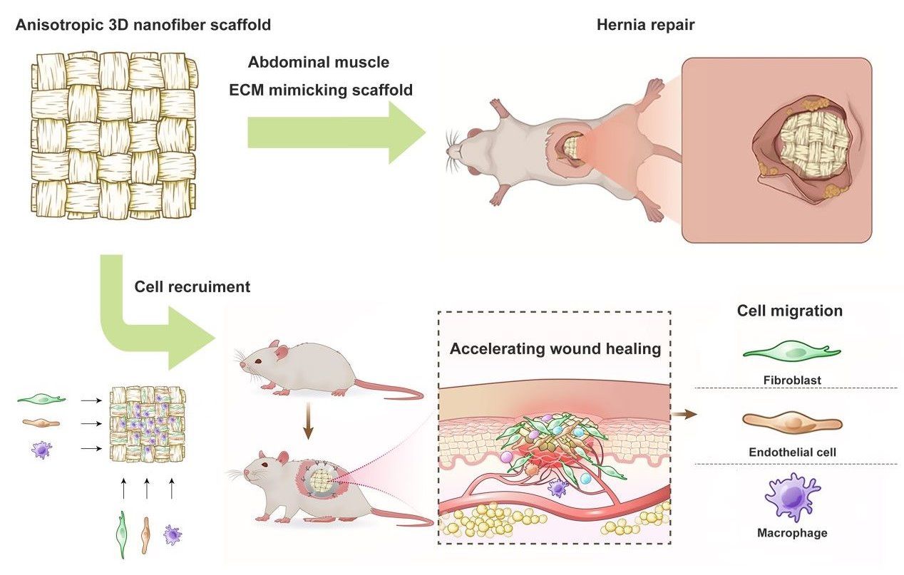 创伤后大面积软组织缺损的修复是外科面临的一大挑战,开发具有适当拉伸强度和良好细胞响应的多功能支架是软组织再生的关键。研究团队结合静电纺丝、编织技术和改良后的气体发泡技术开发了一种各向异性三维纳米纤维支架材料,可用于腹壁肌肉缺损的修复和促进糖尿病皮肤创面的愈合。该材料具有力学性能可调、细胞相容性好、易于载药的优势,全腹壁缺损模型植入实验显示其具有良好的机械强度,可刺激肉芽组织形成,从而达到促进腹壁缺损部位修复的目的,同时还可以减少肠粘连的现象。另外,该材料对于糖尿病创面修复,具有较高的创面愈合率,可促进肉芽组织形成、胶原沉积和再上皮化。此研究设计的新型各向异性纳米纤维支架材料,可为软组织的优化再生提供一种有效的方法。