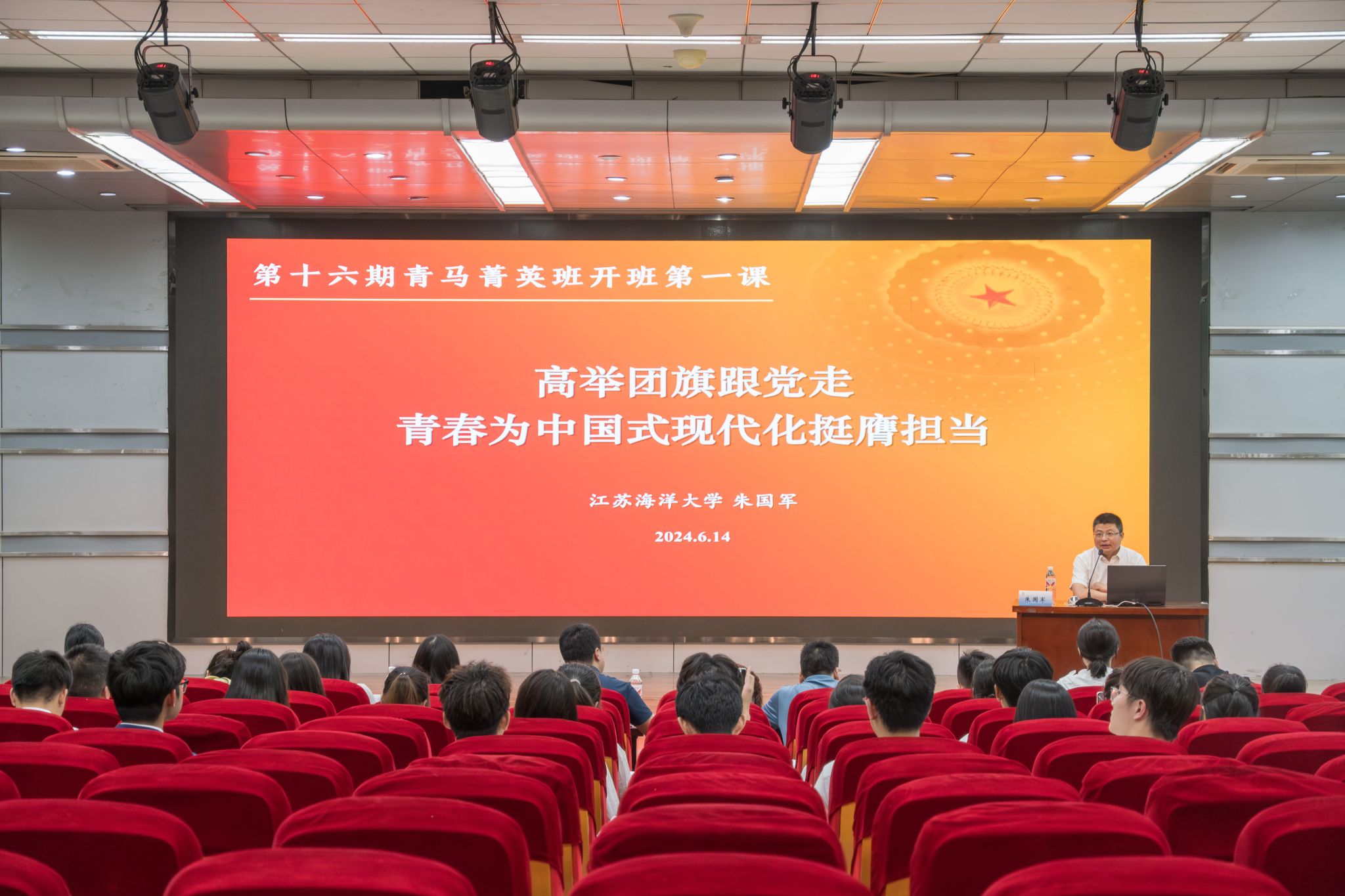 开班仪式后,校党委常委、副校长朱国军为十六期青马菁英班学员讲授开班第一课《高举团旗跟党走,青春为中国式现代化挺膺担当》。他围绕“我们应该成为什么样的新时代青年”“我们应该成为什么样的团学干部”“我们如何成为一名优秀的团学干部”三个方面,层层递进地讲述了海大青年学生骨干要传承“爱党、爱国、爱岗,老实、踏实、扎实”这一海大青年固有的优秀品质,强化挺膺担当意识,在学习、工作、生活、职业各方面做到走在前,做示范。