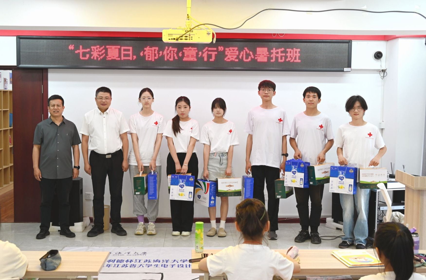 团委书记黄吉庆、党委研工部副部长秦海波为2024年“西部计划”“乡村振兴计划”志愿者代表赠送出征装备,党委学工部部长陈德翼、连云港市红十字会事业发展部部长郑雄辉为2024年省市级“博爱青春”暑期志愿服务立项团队授旗。