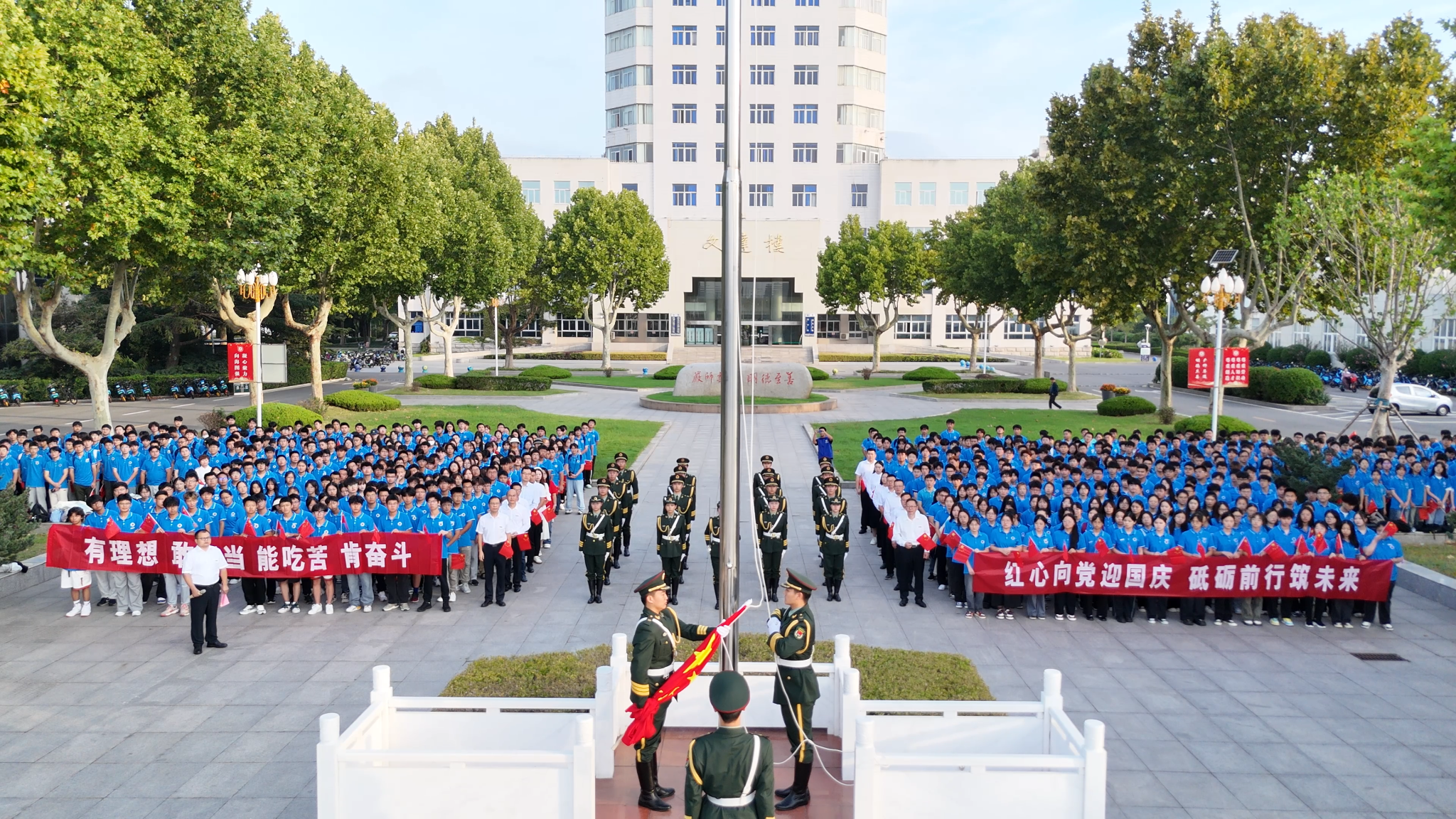 “我和我的祖国,一刻也不能分割,无论我走到哪里,都流出一首赞歌...”在校大学生艺术团的领唱下,全体师生齐声高唱《我和我的祖国》,歌声响彻云霄,每一个音符都流露着对祖国的衷心依恋,每一句歌词都饱含着对祖国的真诚歌颂。这一刻,全校师生心手相连,共同向伟大的祖国致以最崇高的敬意和最真挚的祝福。