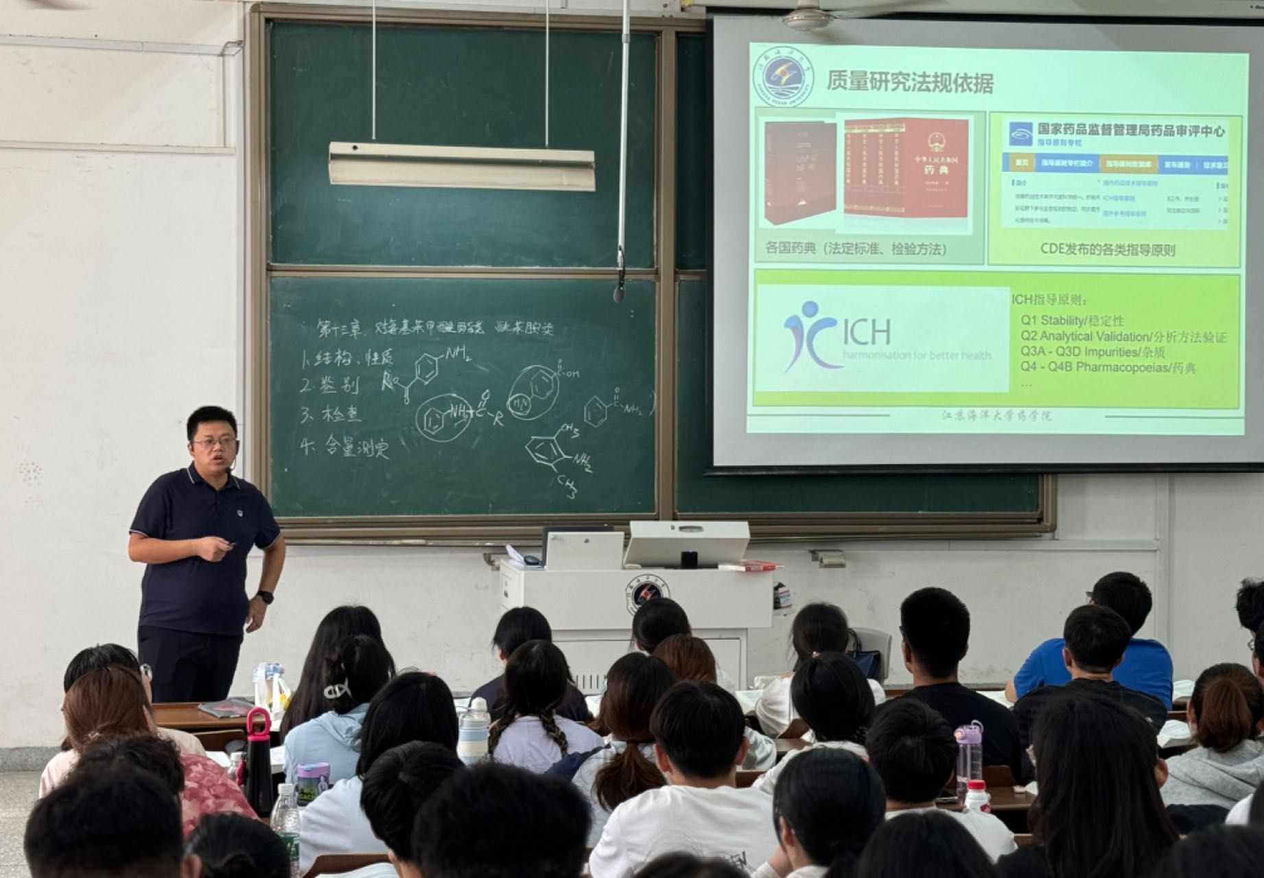 秦昆明教授以“对氨基苯甲酸酯类和酰苯胺类局麻药的分析”为主题,从问题导入课程,采用理实结合的教学方法,通过融合行业企业实际应用案例,以思维进阶的方式,引导学生运用已有知识解决新问题,并巧妙地将中医药文化中所蕴含的思政元素与教学内容深度融合,鼓励学生扎实专业学习,为将来的职业生涯发展打下坚实的基础。徐雷总监围绕课程教学内容,以企业新药研发过程为例,为学生讲授了药品质量标准研究的主要环节、主要内容,以及需要重点关注的问题,不仅使学生加深了对相关专业理论知识的理解,更激发了对创新应用与实践的兴趣和热情,产生了良好的教学效果。