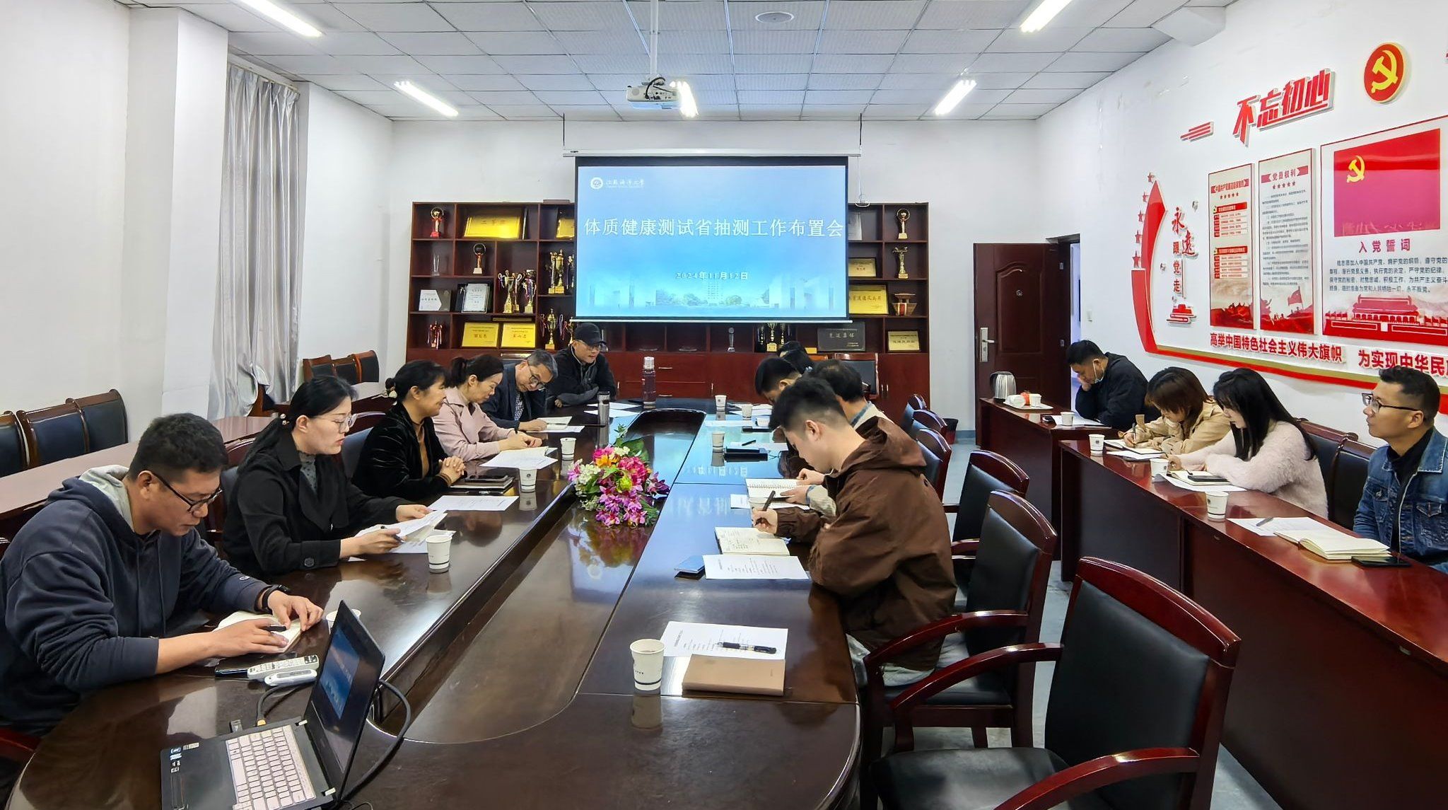 会上,李淑华传达了10月17日召开的江苏省属高校《国家学生体质健康标准》监测工作部署会精神,为大家解读了《2024年江苏省属高校〈国家学生体质健康标准〉监测工作方案》的工作要求。体质测试中心主任朱江详细布置了我校抽测的具体工作安排,包括抽测项目、流程、人员组织、安全保障等关键内容,并讲解了今年首次启用的红外测试仪器设备以及学生测试时需要注意的事项,为后续抽测工作的有序开展提供了清晰的指引。