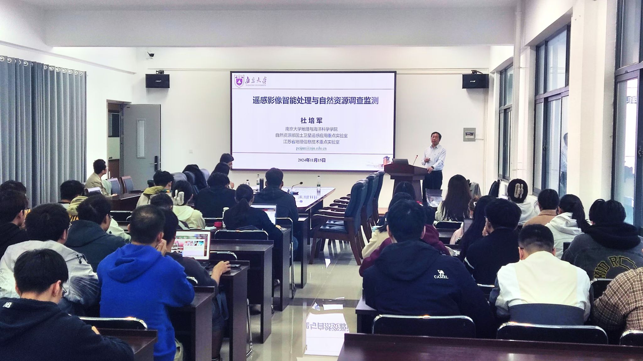 在报告中,杜培军从国家战略、行业需求和科技前沿等入手,详细阐述了目前国内外遥感科技的发展态势,结合智能分类识别与调查、变化检测与动态监测等实例,深入分析了遥感技术的实际应用案例及其价值,对遥感学科的未来发展趋势与应用场景进行了展望,报告内容丰富,直面行业热点难点,开拓了师生们的研究思路和学术视野,与会师生表示受益匪浅。