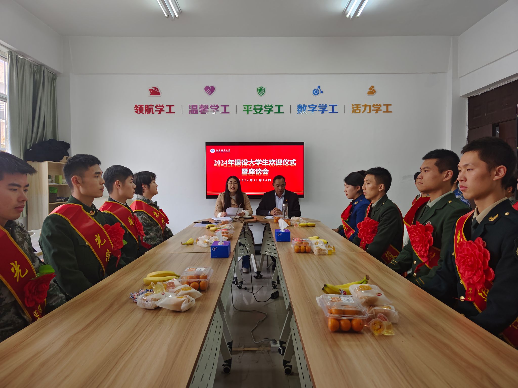 为做好退役大学生复学帮扶,落实慰问关怀,11月20日下午,人民武装部在文渊楼161会议室举行2024年退役大学生欢迎仪式暨座谈会。校人民武装部副部长张志浩、2024年退役大学生代表参加了欢迎仪式。
