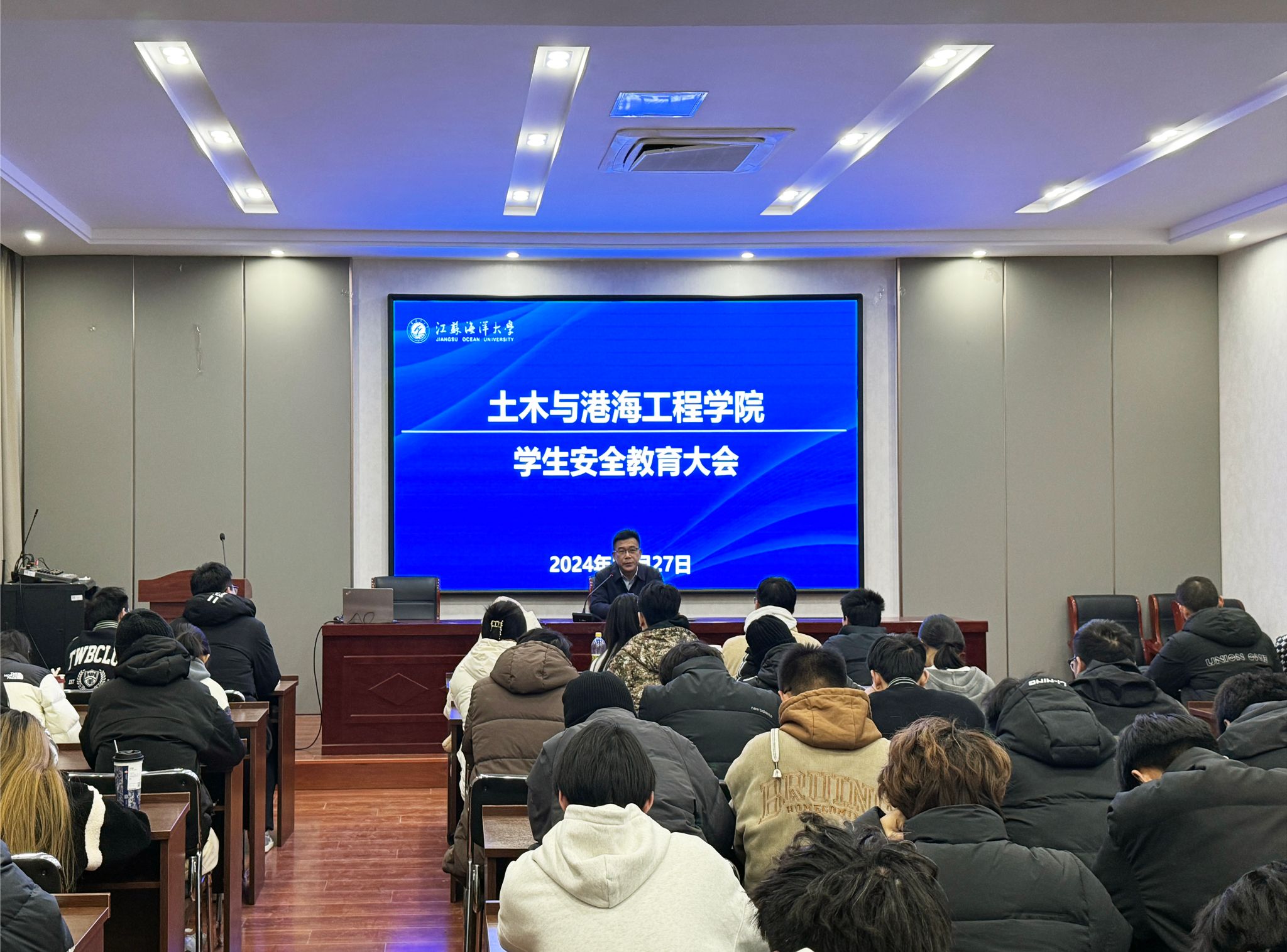 为进一步强化安全教育工作,切实增强大学生的安全意识,确保校园安全稳定,11 月 27 日下午,校党委常委、副校长郑利军在土木楼 207 室为土木与港海工程学院学生开展安全教育专题讲座。学院全体学生安全信息员、学生骨干以及部分宿舍长参与。