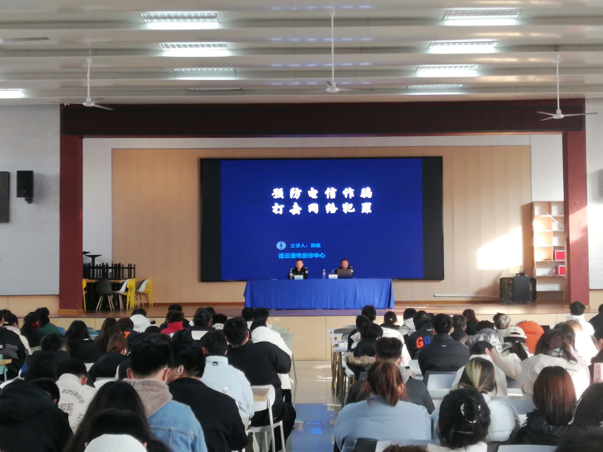 为防范网络电信诈骗,12月11日下午,我校保卫处联合学生处邀请连云港市反诈中心专家魏巍警官为通灌校区学生骨干举办“预防电信诈骗 打击网络犯罪”安全教育专题讲座。通灌校区驻校民警刘警官主持讲座,通灌校区10个学院辅导员代表和近300名学生骨干参加讲座。