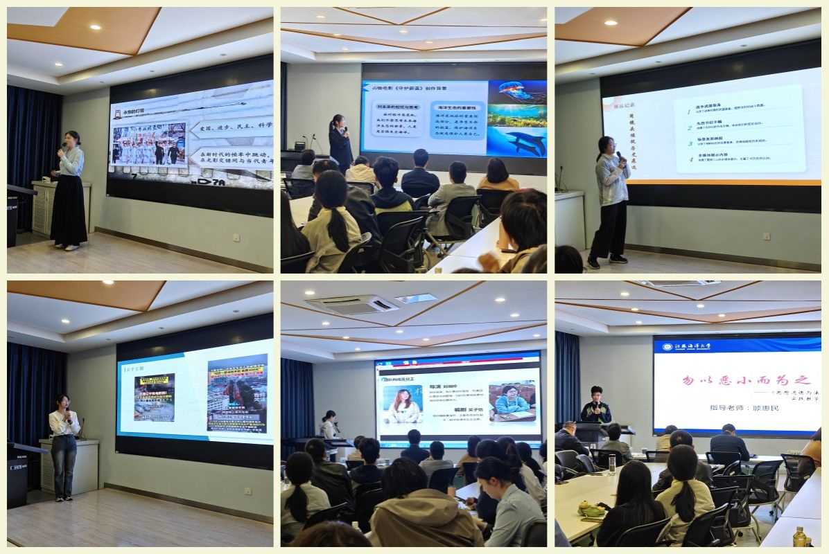 经过前期遴选,共有6件作品参与展示评比。本次展示评比采用“双视角解读”模式,由指导教师结合思政课实践教学主题揭示成果的理论和实践意义,学生团队则分享制作过程、作品构思和心得体会,形成“理论指导——实践转化”的立体对话。6件作品分别围绕《毛泽东思想和中国特色社会主义理论体系概论》《中国近现代史纲要》《思想道德与法治》等课程展开,或是再现历史场景,营造历史与现实的时空对话,或是以核污染危机为切口,警示生态环境治理刻不容缓,或是以小见大,将法治精神融入青春叙事,或是在红色革命场馆中追寻红色踪迹,回望历史长河。