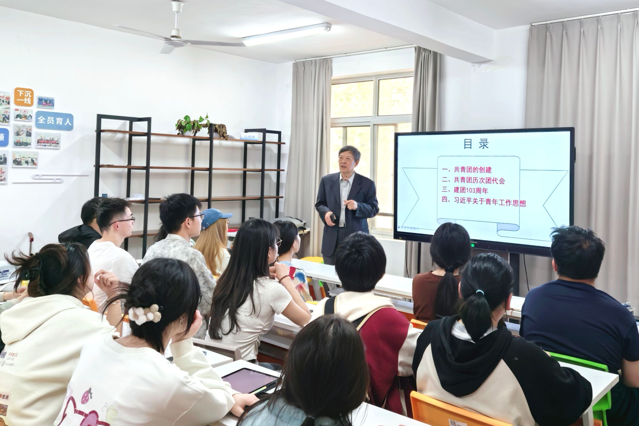 4月16日下午,校关工委驻会老同志、“海韵”讲师团成员刘平昌教授走进“一站式”学生社区A7/A8楼205室,为文法学院入团积极分子培训班授课。51名入团积极分子参加学习。