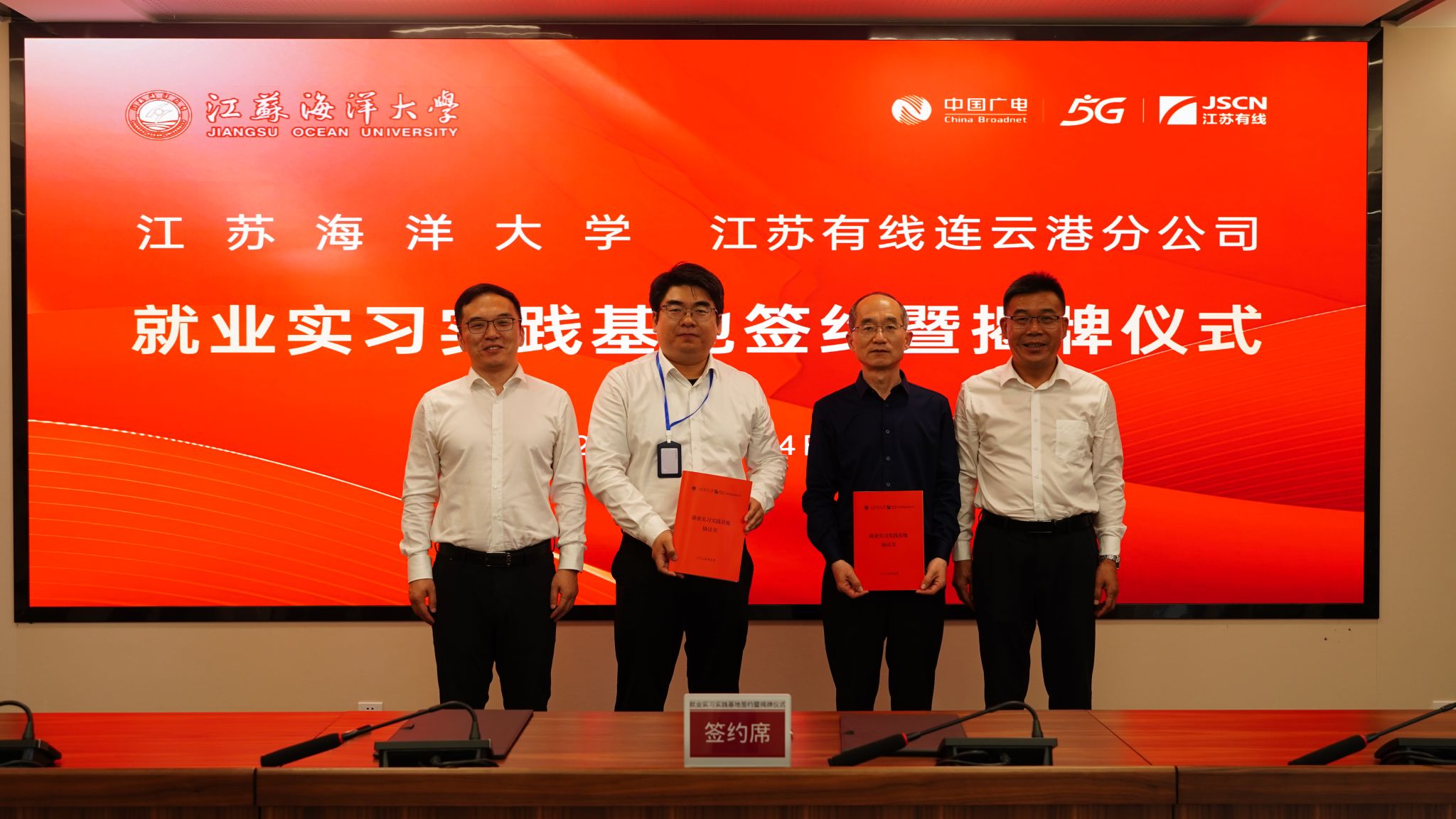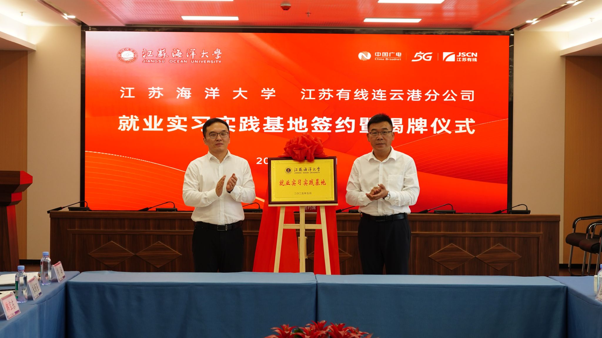 郑利军与张东伟为“江苏海洋大学就业实习实践基地”揭牌,招生与就业处处长马恒通与江苏有线连云港分公司党委委员、纪委书记杨彦歆签约“江苏海洋大学就业实习实践基地”协议,双方与会人员还就合作相关具体事宜进行了深入交流。