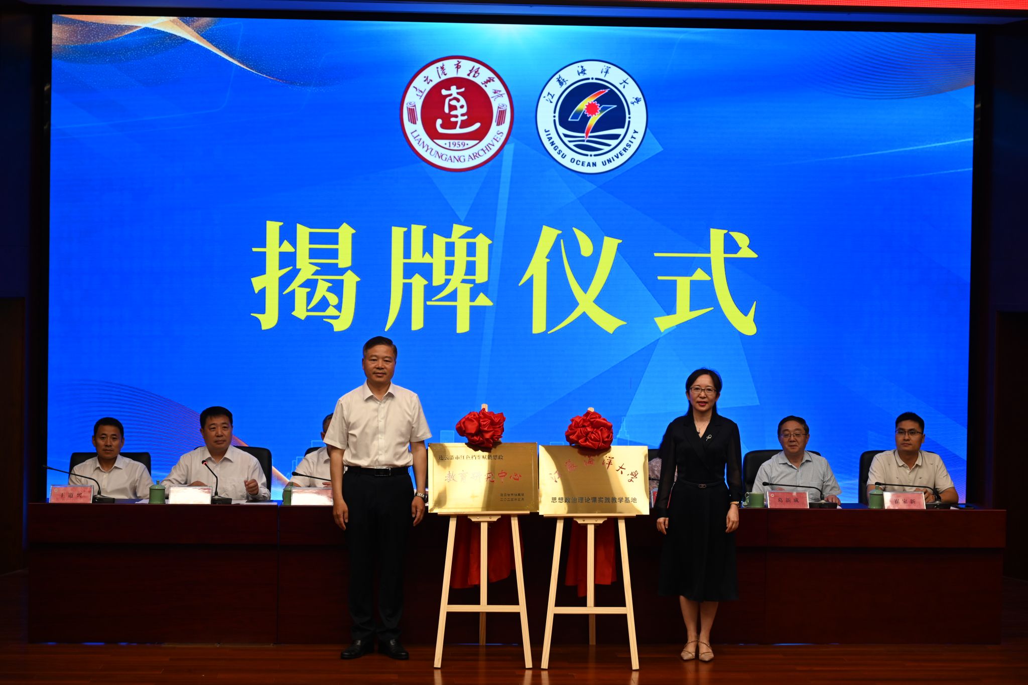 金芙蓉与许思文共同为“江苏海洋大学思想政治理论课实践教学基地”“连云港市红色档案赋能思政教育研究中心”揭牌。连云港市档案馆向马克思主义学院赠送《人民楷模王继才精神研究》《连云港史话》十卷本等书籍。