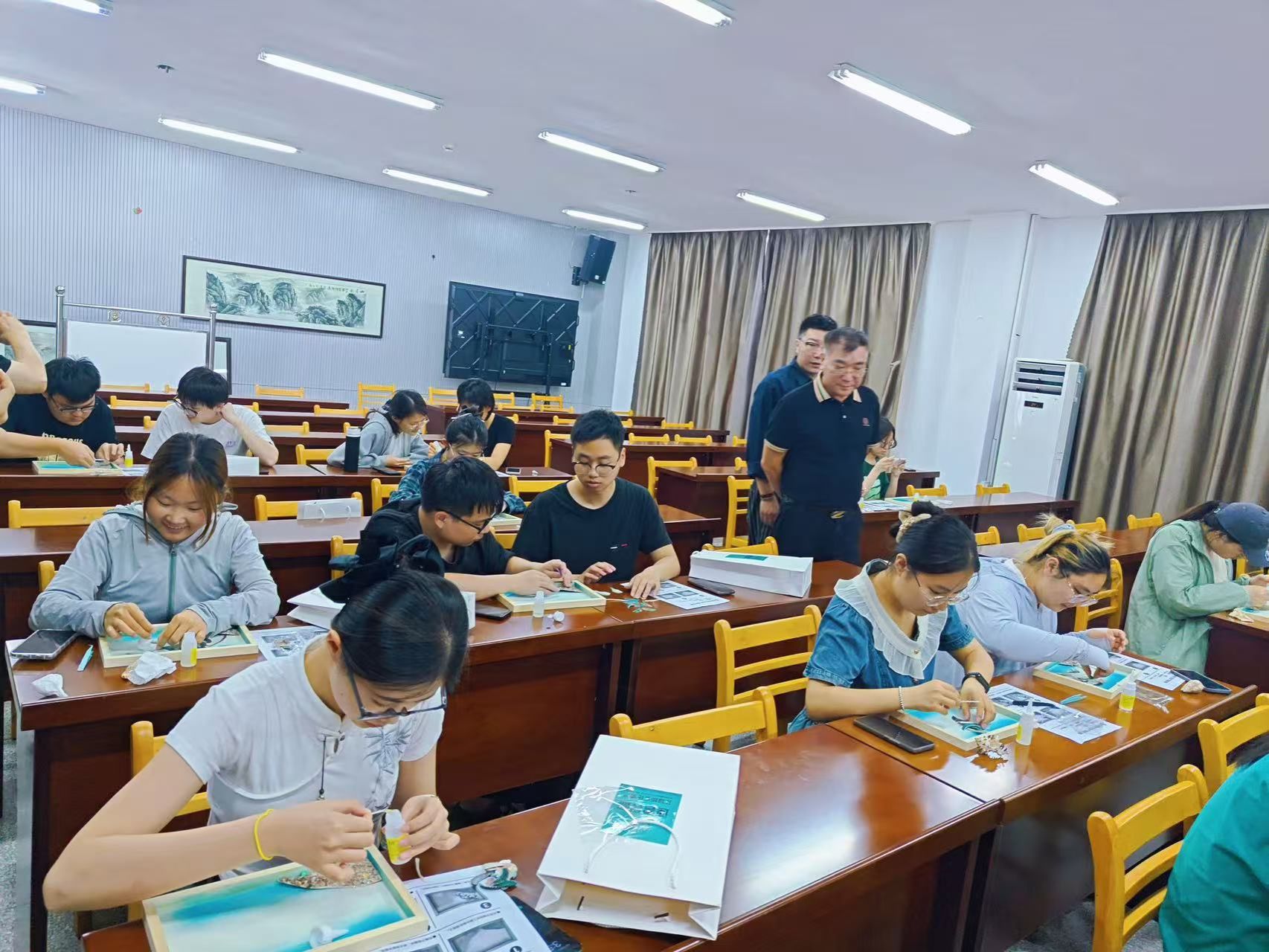 活动现场,陈建国老师及其助手分别讲授了贝壳的种类、特点和形成过程;深入浅出介绍了贝雕的历史渊源、制作技艺和文化内涵。还展示了部分有代表性的精美⻉雕作品,现场学生通过近距离观摩贝雕画作,深刻感受到海洋文化遗产传统工艺“化平凡为神奇”的魅力。实践环节中,图书馆为同学们提供了20套免费专属贝雕材料包和工具,在老师的指导下,学生亲手制作贝雕作品,设计造型,在拼贴中感受传统工艺的精妙。两位同学的作品将收藏在连云港老街的贝雕博物馆里。