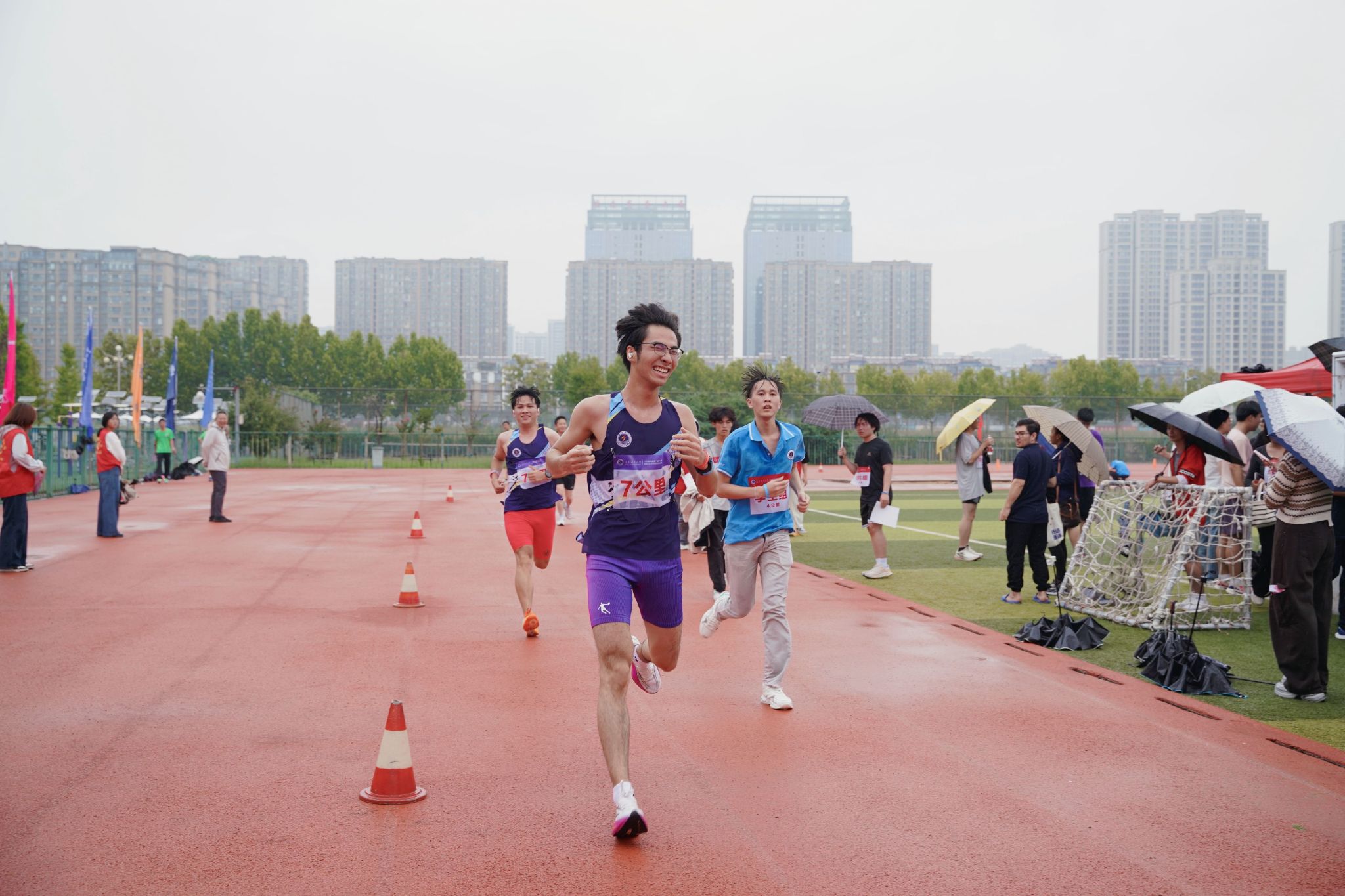 随着发令枪响起,千余名师生从苍梧校区西运动场出发,冒雨踏上赛道。本次比赛分为4公里、7公里两个组别进行,其中4公里组别分教工男子、教工女子和学生男子、学生女子四个组,7公里组别分男子组、女子组两个组进行。参赛师生按规定的比赛路线出发,在各检查点集齐不同颜色手环后通过终点视为完成比赛,比赛以用时长短决出名次,用时越短则名次越靠前,全程以规范流程保障比赛的公平公正。
