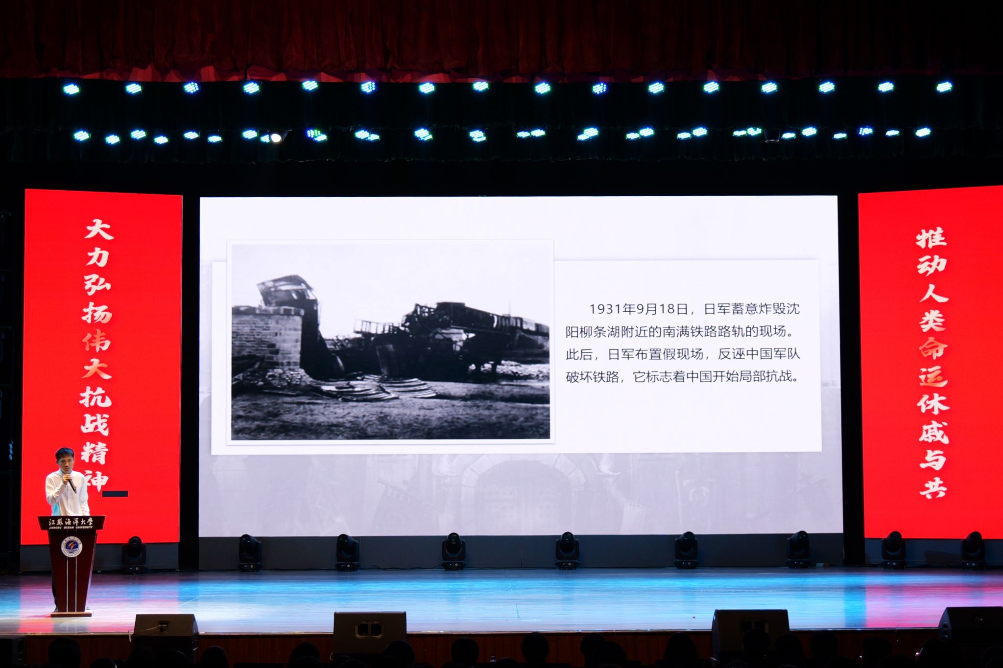 9月28日晚,江苏海洋大学“铭记历史 挺膺担当”音乐思政课在苍梧校区大礼堂举行。相关单位负责人及1300余名师生齐聚现场,同上一堂音乐思政大课,让红色历史“声”入人心。