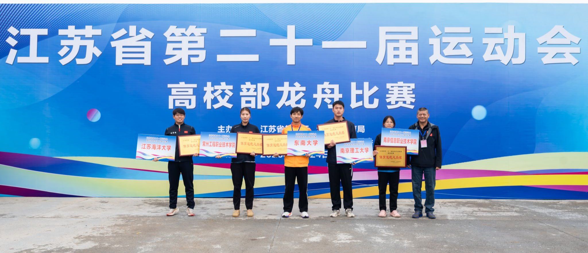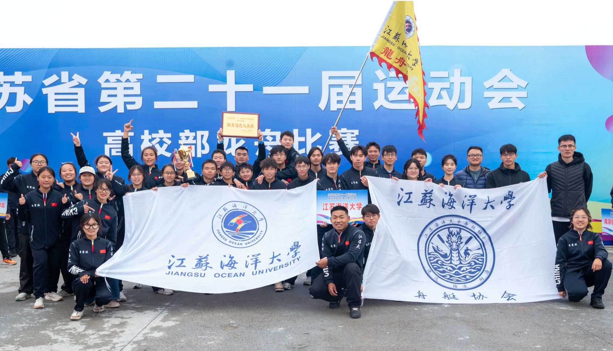 10月24日至26日,由江苏省教育厅、江苏省体育局联合主办,江苏海洋大学承办的江苏省第二十一届运动会高校部龙舟比赛,在连云港市徐圩新区拓展训练中心龙舟赛场激情开赛。经过多轮激烈角逐,我校龙舟队凭借“三金一银”的单项佳绩,以绝对优势斩获甲B组团体总分第一名。队伍在赛事中展现出的文明参赛、尊重对手的良好风貌,赢得裁判与各高校队伍的一致认可,获得“体育道德风尚奖”,实现“竞技成绩”与“精神文明”的双丰收。