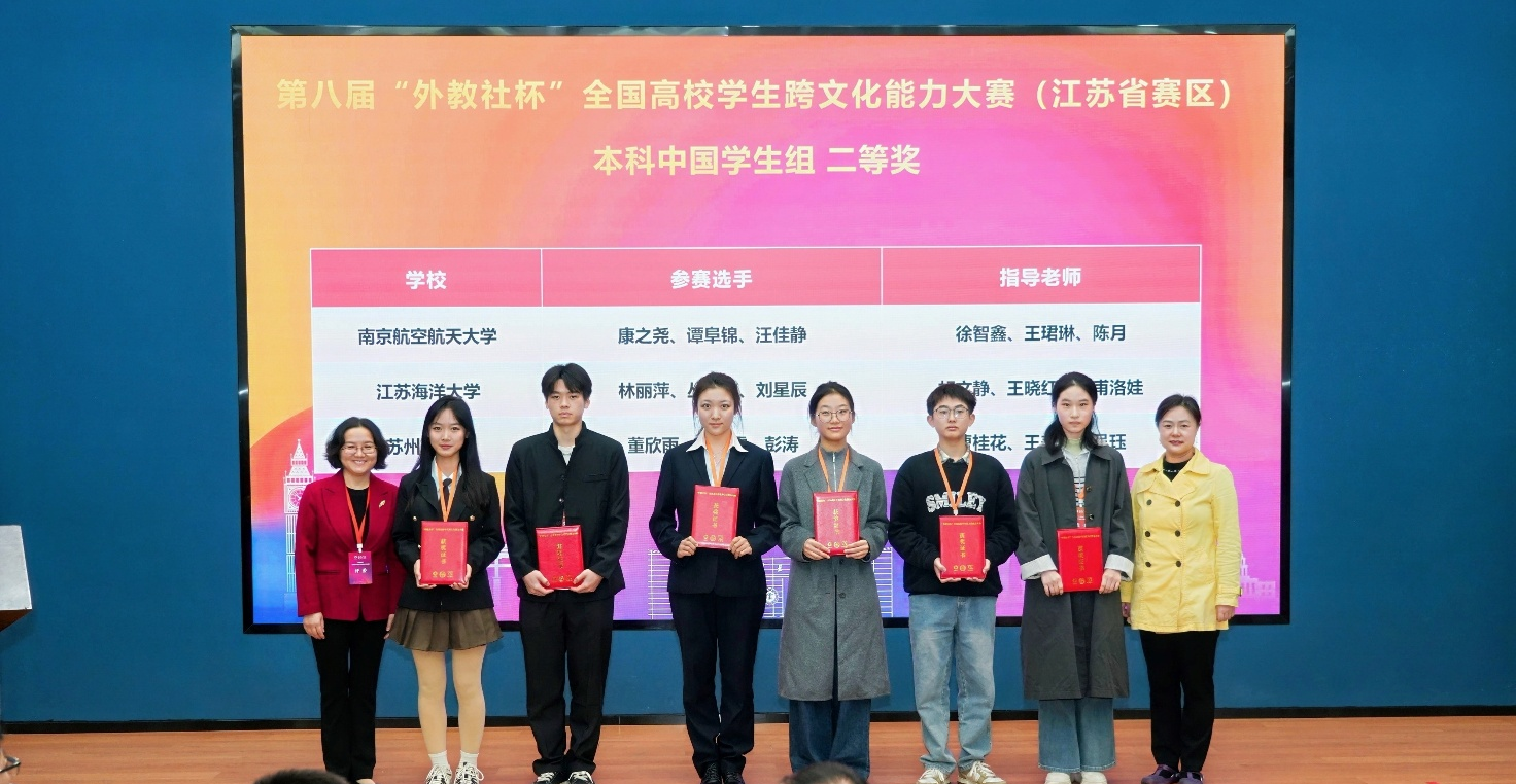 10月24日至26日,第八届 “外教社杯” 全国高校学生跨文化能力大赛江苏省赛区比赛在中国矿业大学落幕。大赛设本科中国学生组、高职中国学生组和国际学生组,来自省内70所高校的81支团队、200余位选手参加角逐。我校外国语学院英语1231班林丽萍同学、俄语1221班丛显懿同学及土木与港海工程学院港口1232班刘星辰同学组成的团队斩获本科中国学生组二等奖。